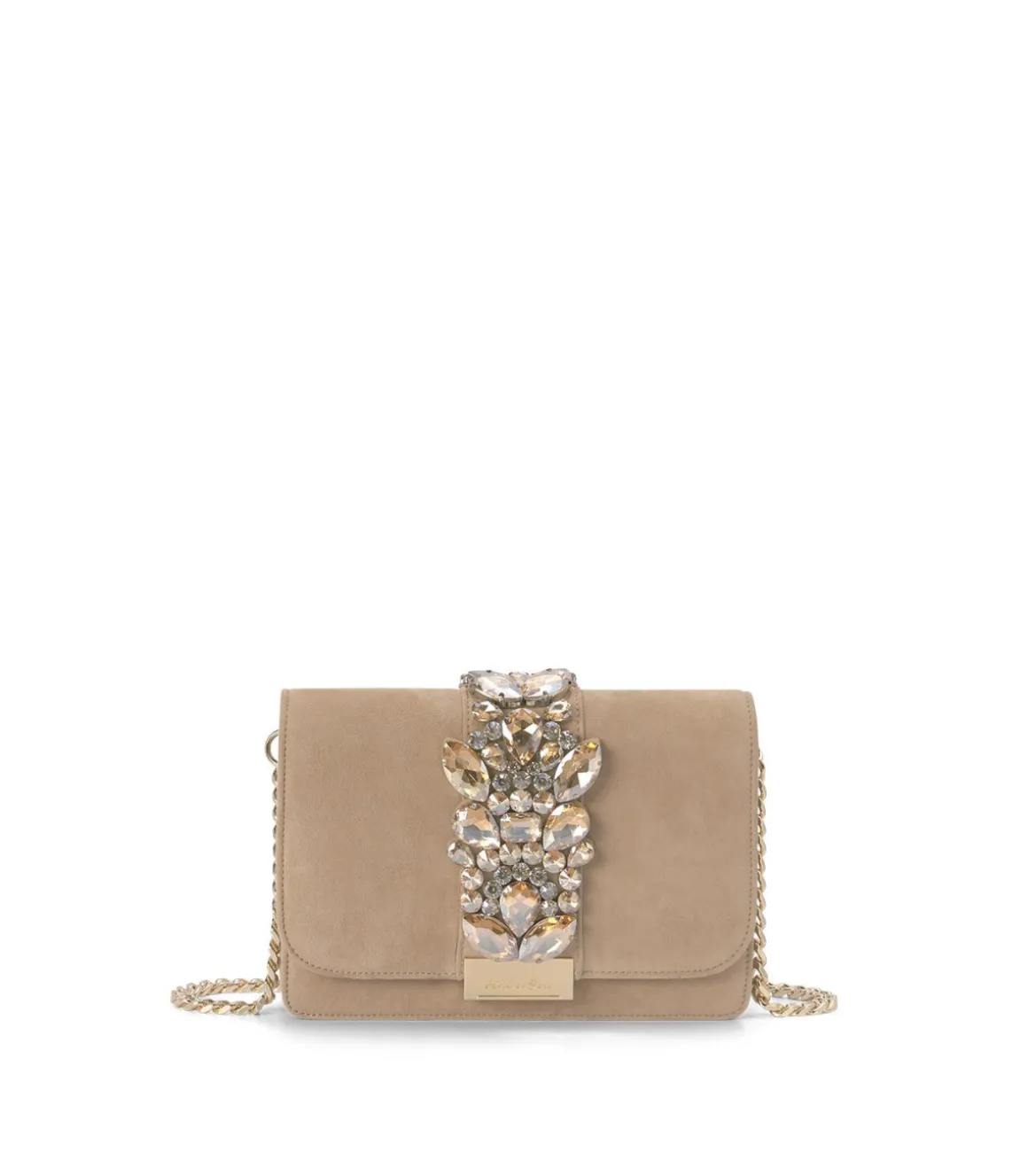 Bolso formato bandolera con cuerpo estilo caja. Detalle de joya en la solapa delantera,grabada con el logo. Interior con forro textil. Asa de cadena función bandolera. Cierre mediante imán.