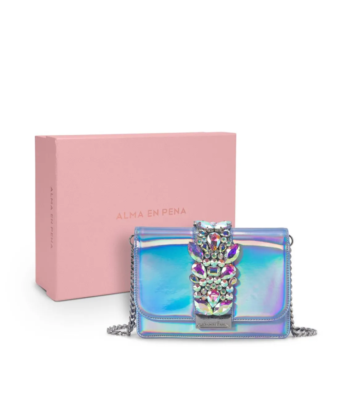 Bolso formato bandolera con cuerpo estilo caja. Detalle de joya en la solapa delantera,grabada con el logo. Interior con forro textil. Asa de cadena función bandolera. Cierre mediante imán.