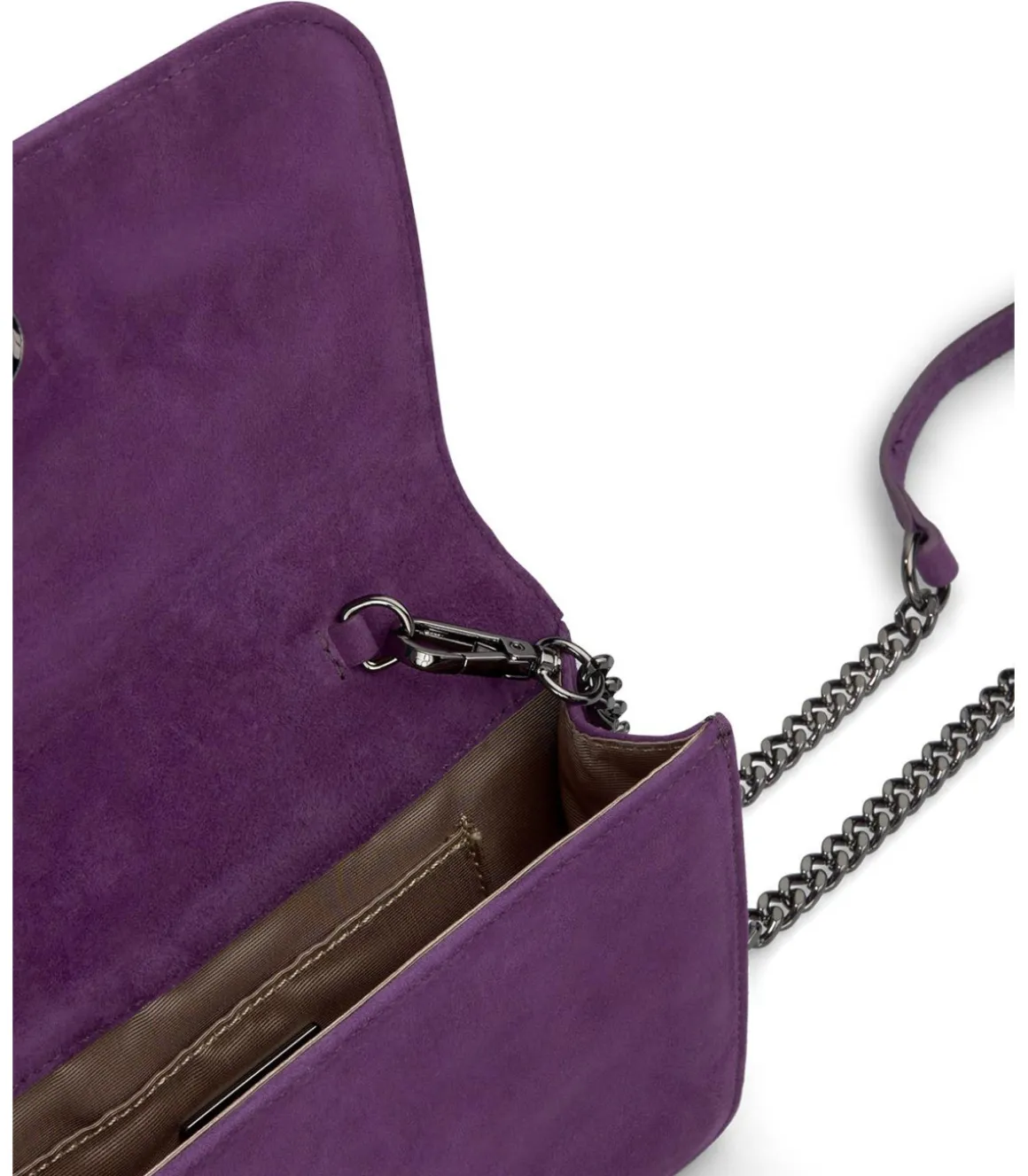 Bolso bandolera con la cabeza de serpiente de pedrería en la solapa. Asa larga de cadena metálica función bandolera. Realizado en piel con interior de forro textil. Cierre mediante imán con detalle de joya en la solapa delantera.