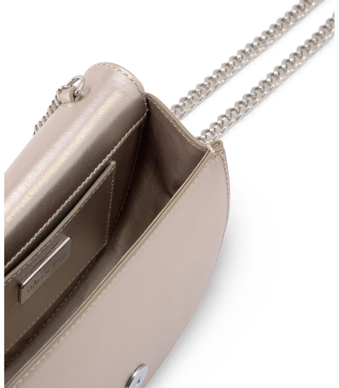 Bolso en forma media luna. Asa de mano metálica en formato anillo y asa larga de cadena metálica función bandolera. Realizado en piel con interior de forro textil. Cierre mediante imán con detalle de joya en la solapa delantera.