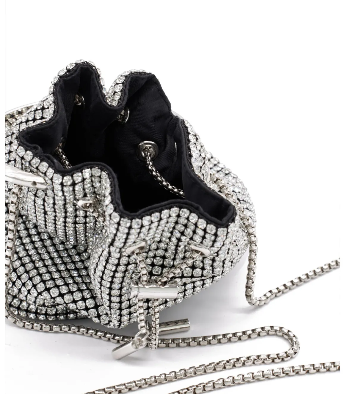 Bolso tipo bombonera conpedrería. Asa metálica circular y cadena metálica función bandolera . Interior de forro textil.