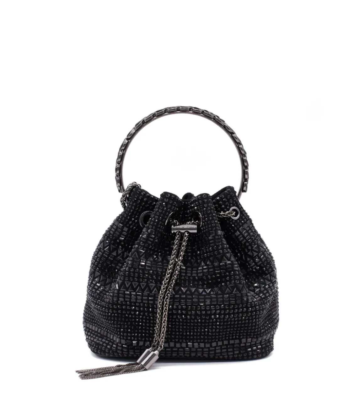 Bolso tipo bombonera realizado en piel. Asa metálica circular y cadena metálica función bandolera. Interior de forro textil.