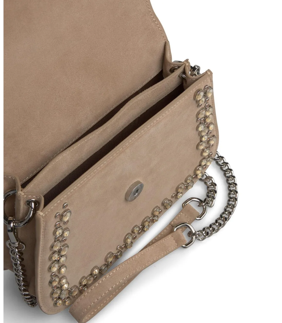 Bolso formato bandolera, detalle cuadrado cubierto con pedrería y tachas de pedrería con flecos colgantes. Asa de mano y asa de cadena metálica larga función bandolera. Realizado en piel con interior de forro textil. Cierre mediante imán con hebilla de joya. Detalle de borla con flecos en la parte inferior.