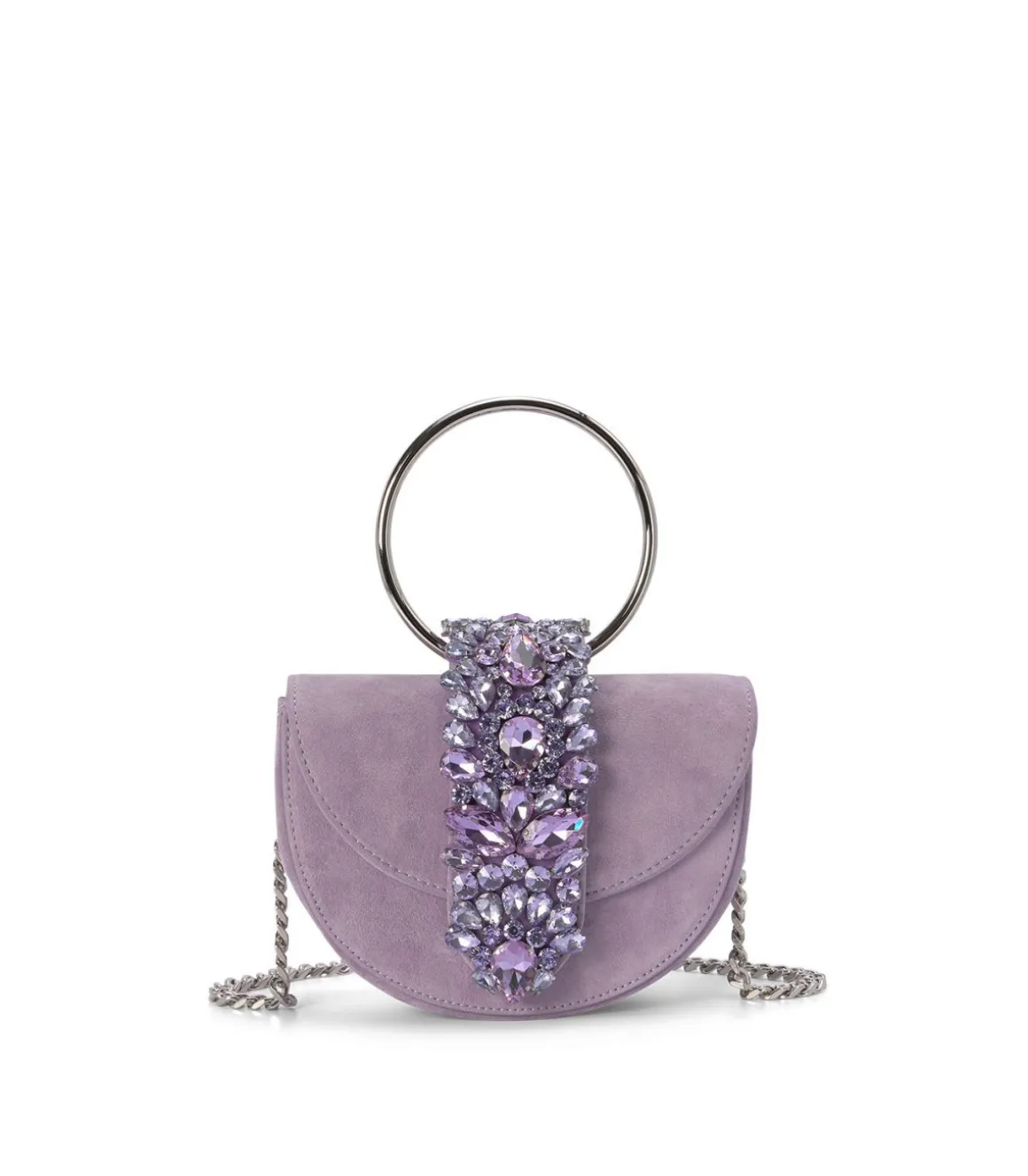 Bolso en forma de media luna. Asa de mano metálica en formato anillo y asa larga de cadena metálica, función bandolera. Interior de forro textil. Cierre mediante imán de joya en la solapa delantera.