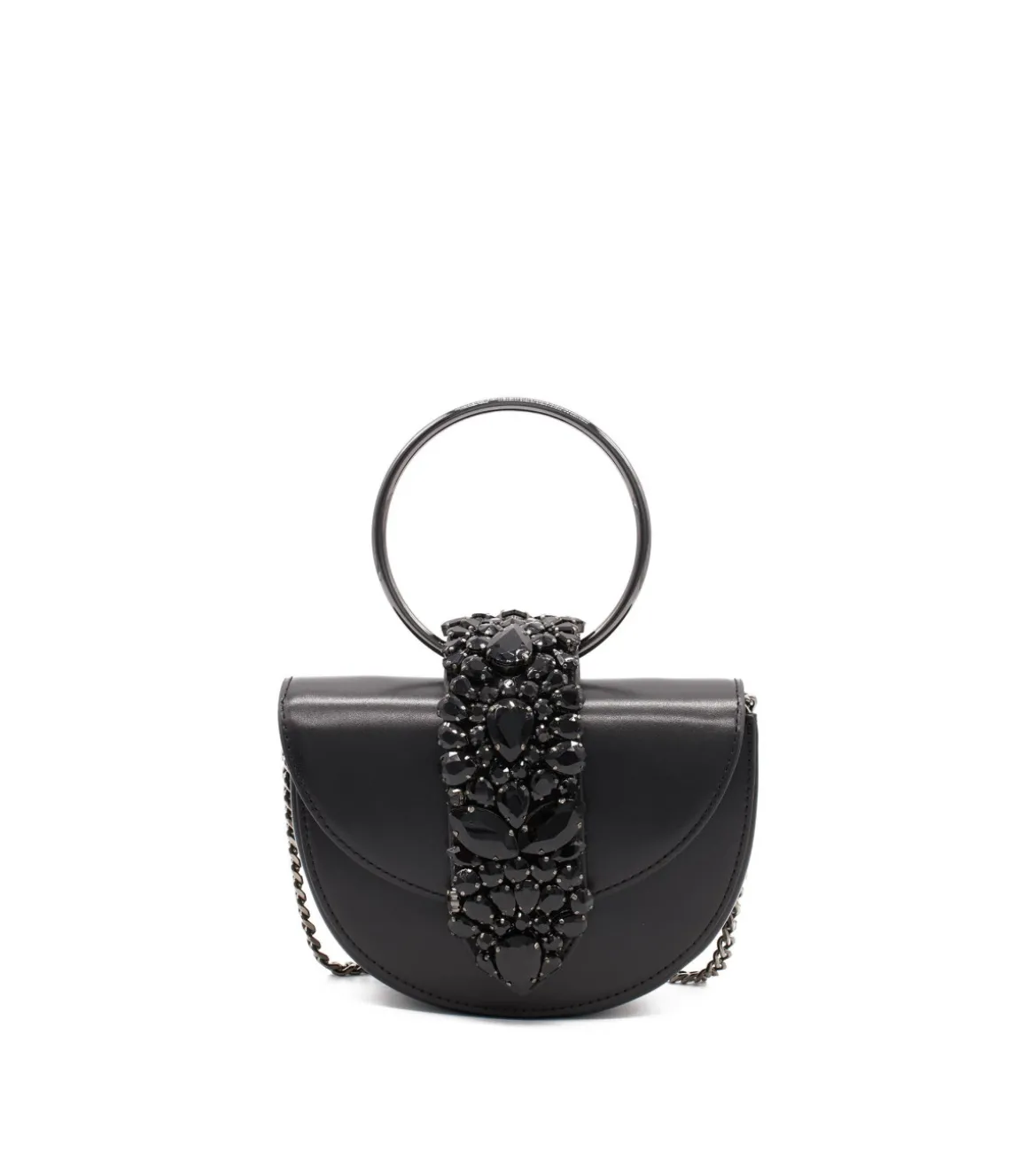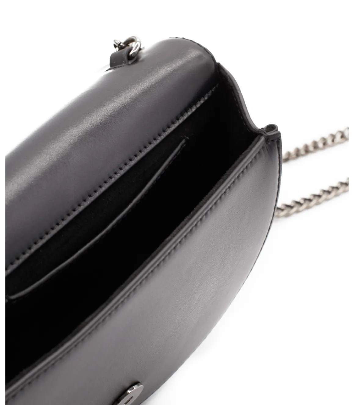 Bolso en forma de media luna. Asa de mano metálica en formato anillo y asa larga de cadena metálica, función bandoler…