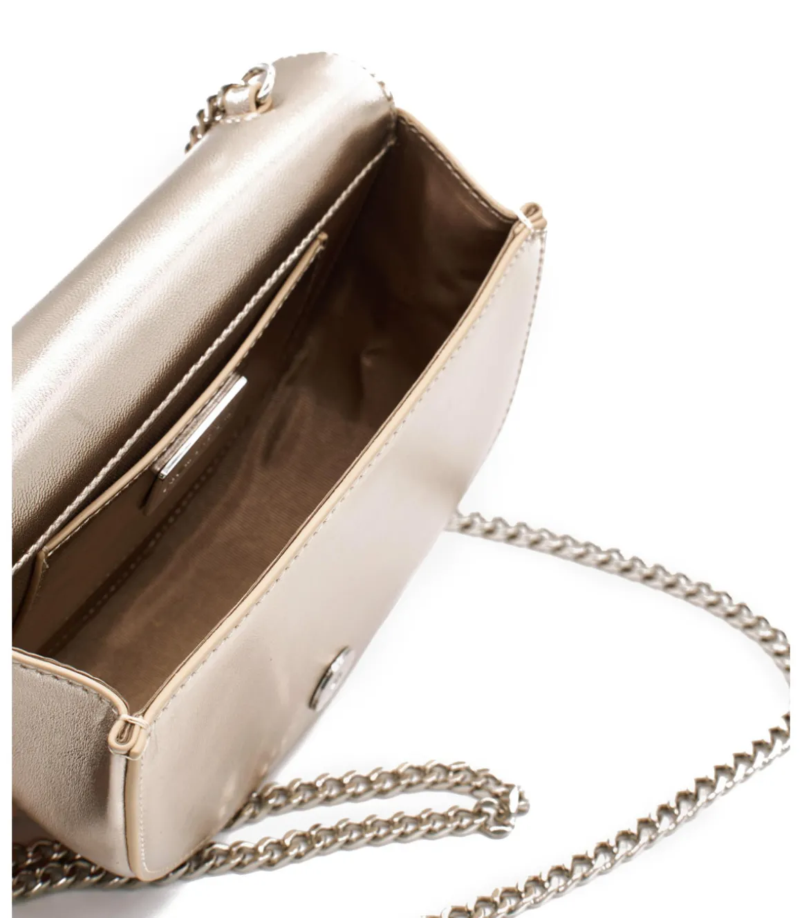 Bolso en forma de media luna. Asa de mano metálica en formato anillo y asa larga de cadena metálica, función bandolera. Interior de forro textil. Cierre mediante imán de joya en la solapa delantera.