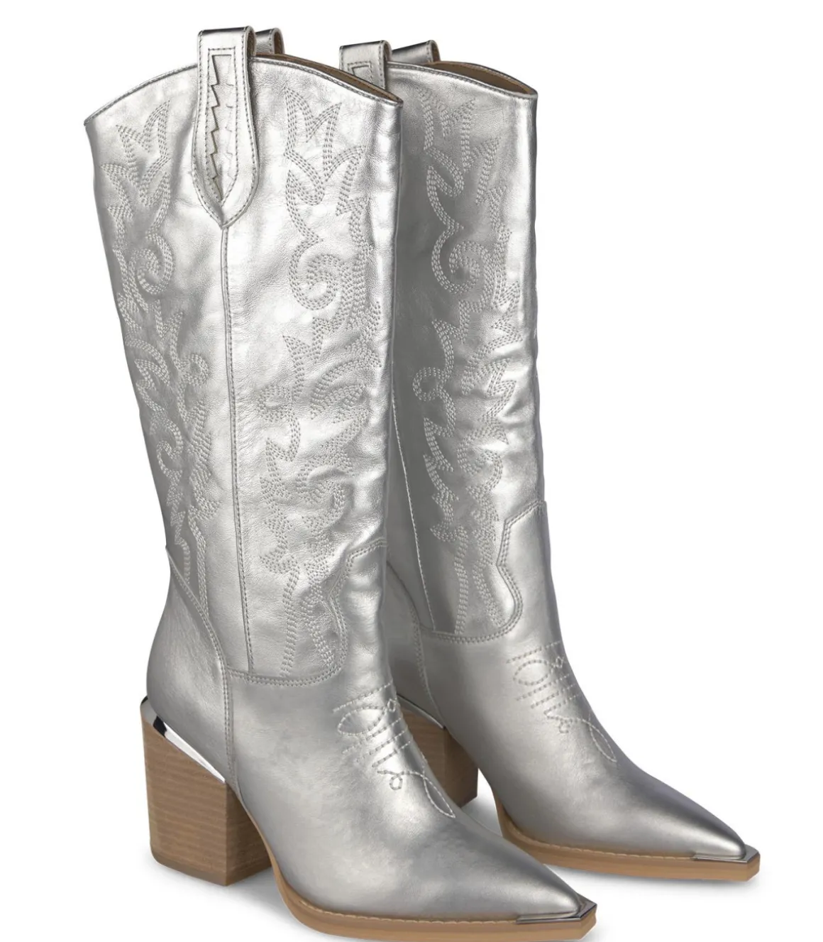 Bota cowboy realizada en piel con bordados. Puntera afilada y tacón bloque. La altura del tacón es de 8cm.