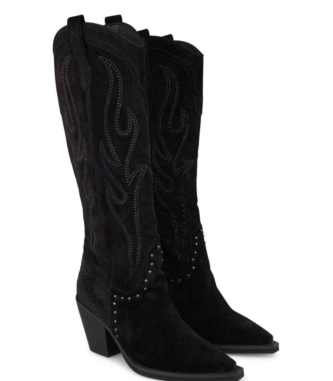Bota cowboy de mujer realizada en piel con adorno de pedrería. Puntera afilada y tacón bloque. La altura del tacón es de 8,5cm.