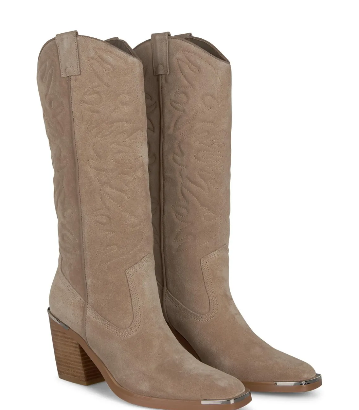 Bota de tacón de mujer con bordados en la caña. Sin cierre y puntera cuadrada. El tacón de tipo bloque inclinado. La altura del tacón es de 8cm y la caña de la bota mide 30,5cm.