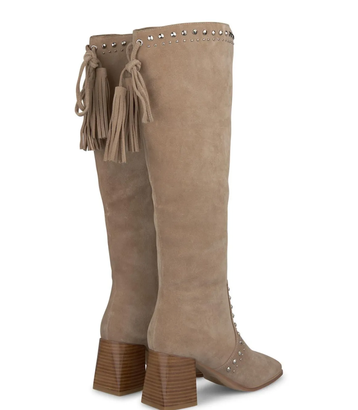 Bota de tacón de mujer realizado en piel, con tachas y borlas traseras colgantes. Puntera redondeada y cierre con cremallera. La altura del tacón de tipo bloque es de 7,5cm y la altura de la caña es de 46cm.