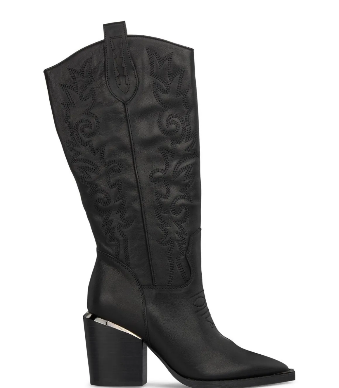 Bota de mujer con tacón tipo bloque. La caña cubierta con detalles bordados y puntera afilada. La altura del tacón es de 8,5cm y la caña de la bota mide 38cm.