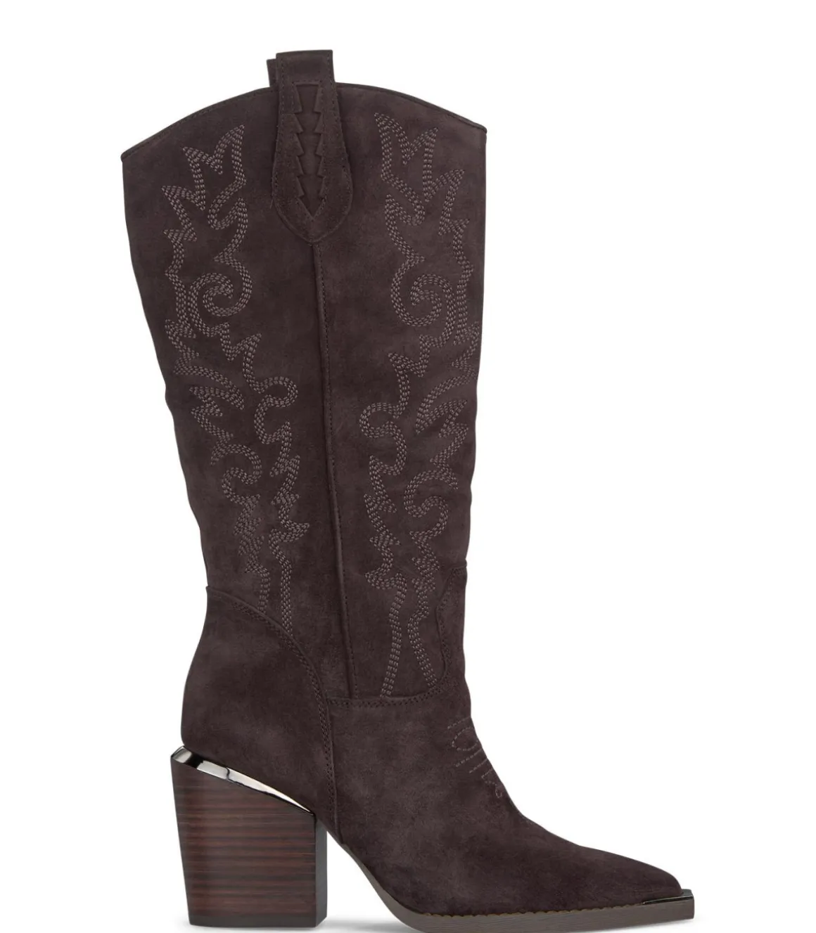 Bota de mujer con tacón tipo bloque. La caña cubierta con detalles bordados y puntera afilada. La altura del tacón es de 8,5cm y la caña de la bota mide 38cm.
