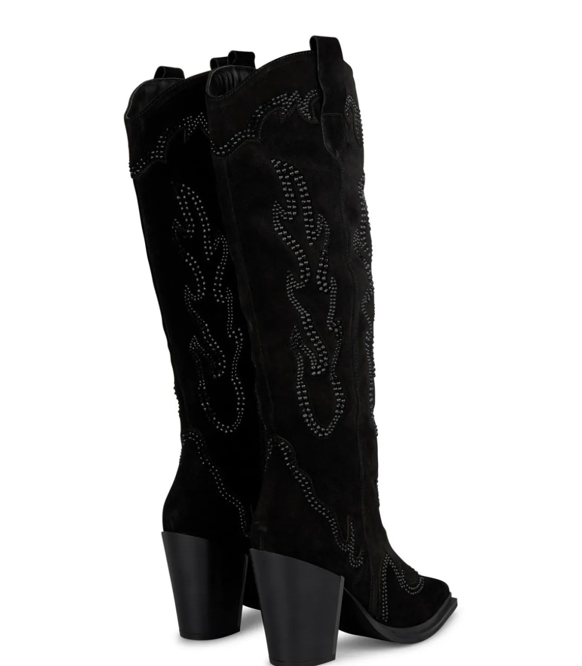 Bota cowboy con tacón de mujer con brillos. Puntera afilada y tacón de tipo bloque, confeccionado en piel. La altura del tacón es de 9,5cm y la caña del botín mide 39cm.