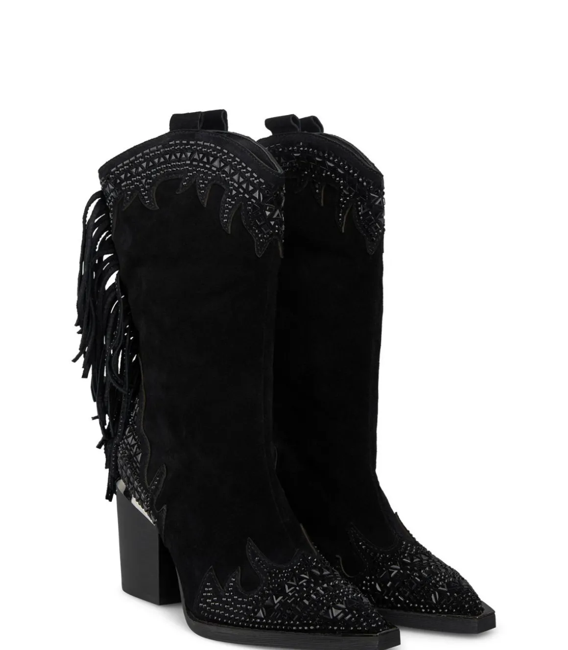 Media bota de mujer con tacón tipo bloque. La caña con detalles brillantes y flecos y puntera afilada. La altura del tacón es de 8,5cm y la caña de la bota mide 25cm.