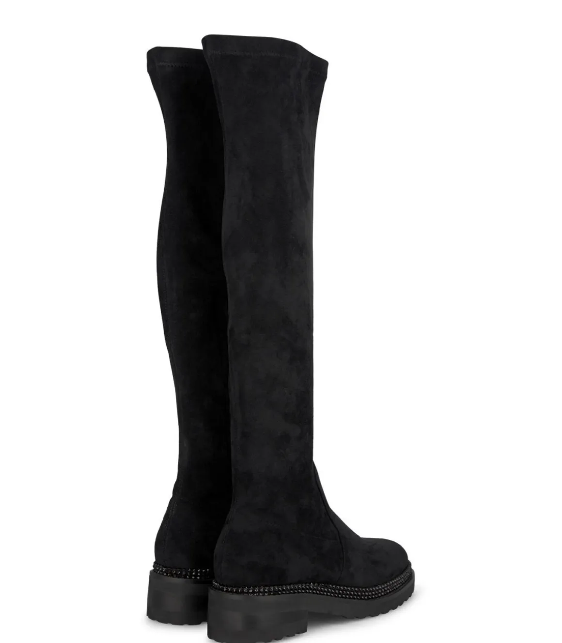 Bota de mujer con suela plana. Con puntera redondeada, confeccionado en piel. La altura del tacón es de 4,5cm y la caña de la bota mide 53cm.