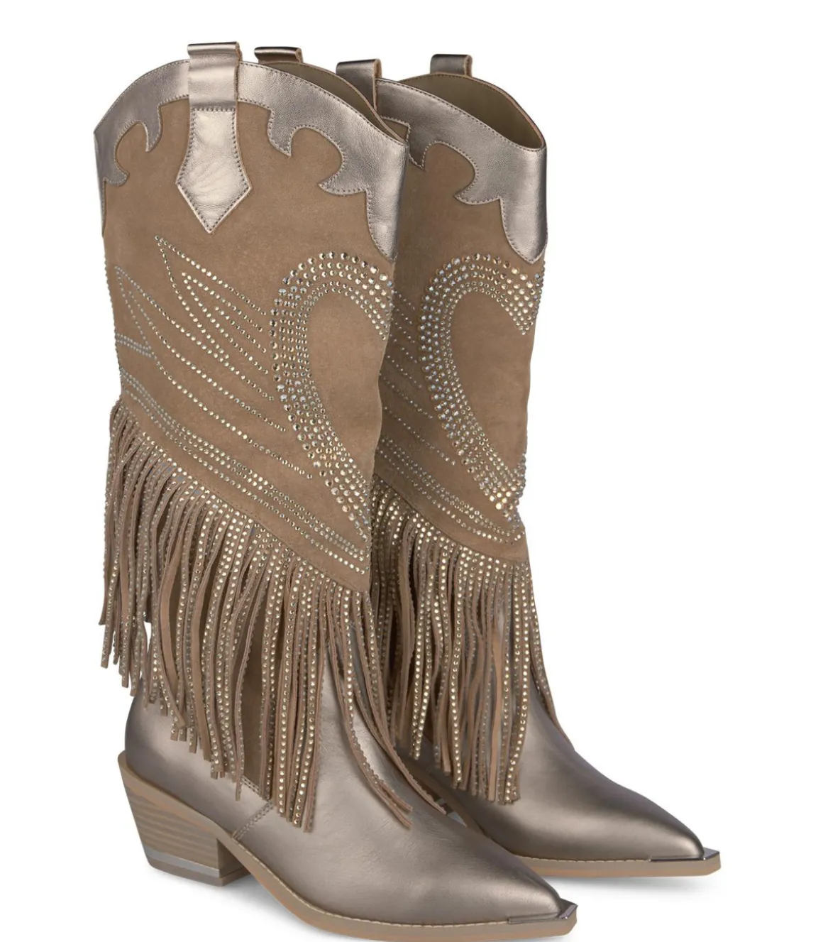 Bota realizada en piel con flecos colgando por la caña. Puntera afilada y tacón bloque. La altura del tacón es de 5,5cm.