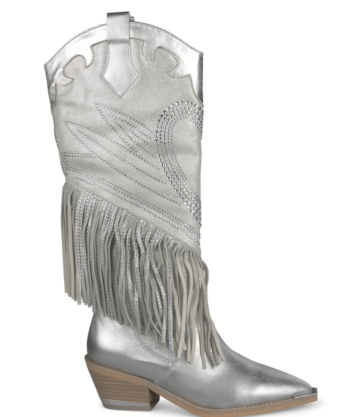 Bota realizada en piel con flecos colgando por la caña. Puntera afilada y tacón bloque. La altura del tacón es de 5,5cm.