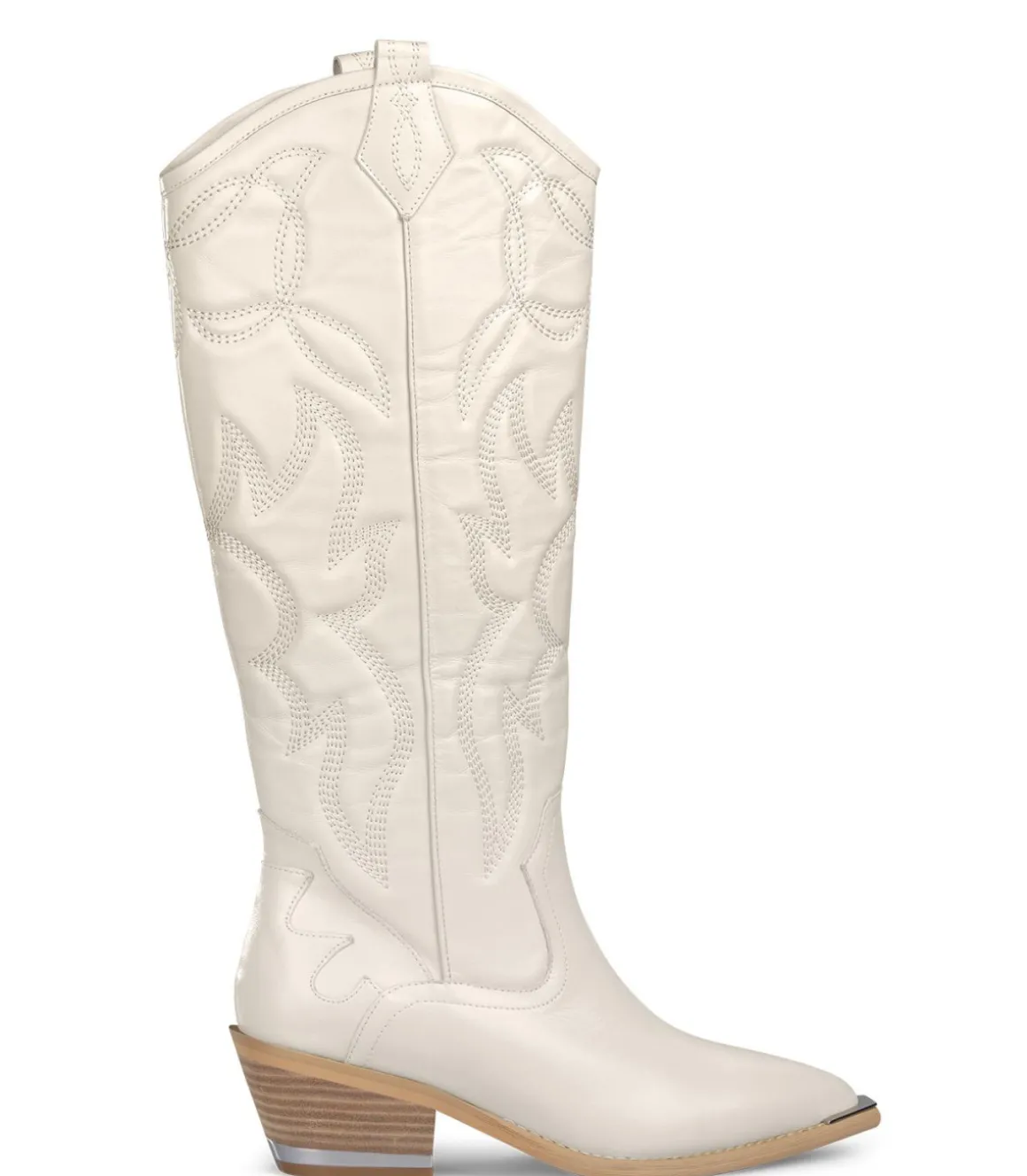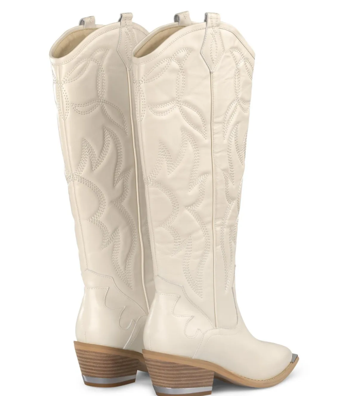 Bota plana de mujer realizada en piel con bordados. La altura es de 36cm. La altura del tacón es de 5,5cm.