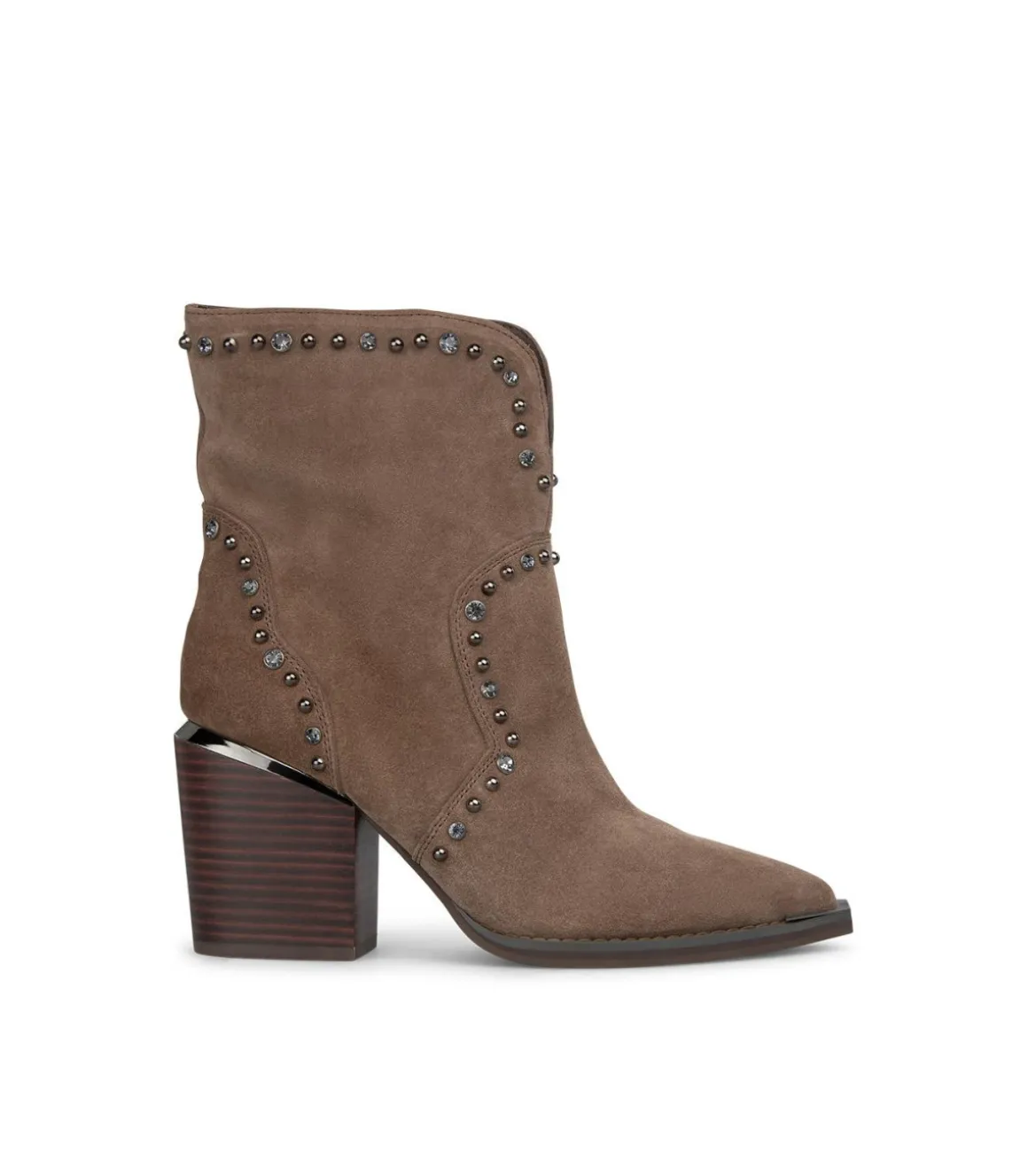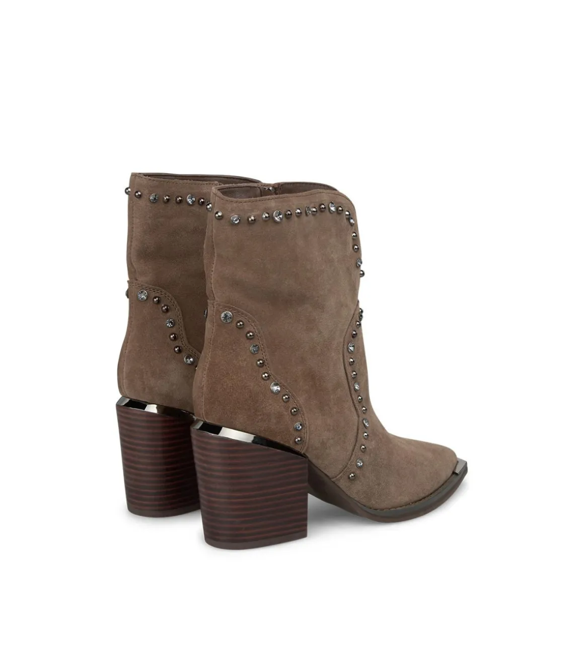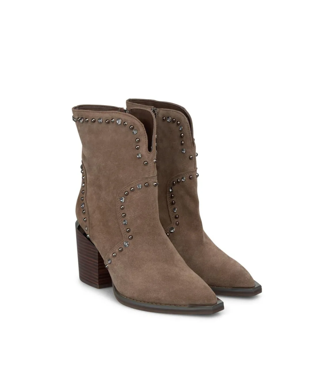 Botín realizado en piel con abertura en la caña y detalle de tachuelas. Puntera afilada y tacón bloque. La altura del tacón es de 8cm.