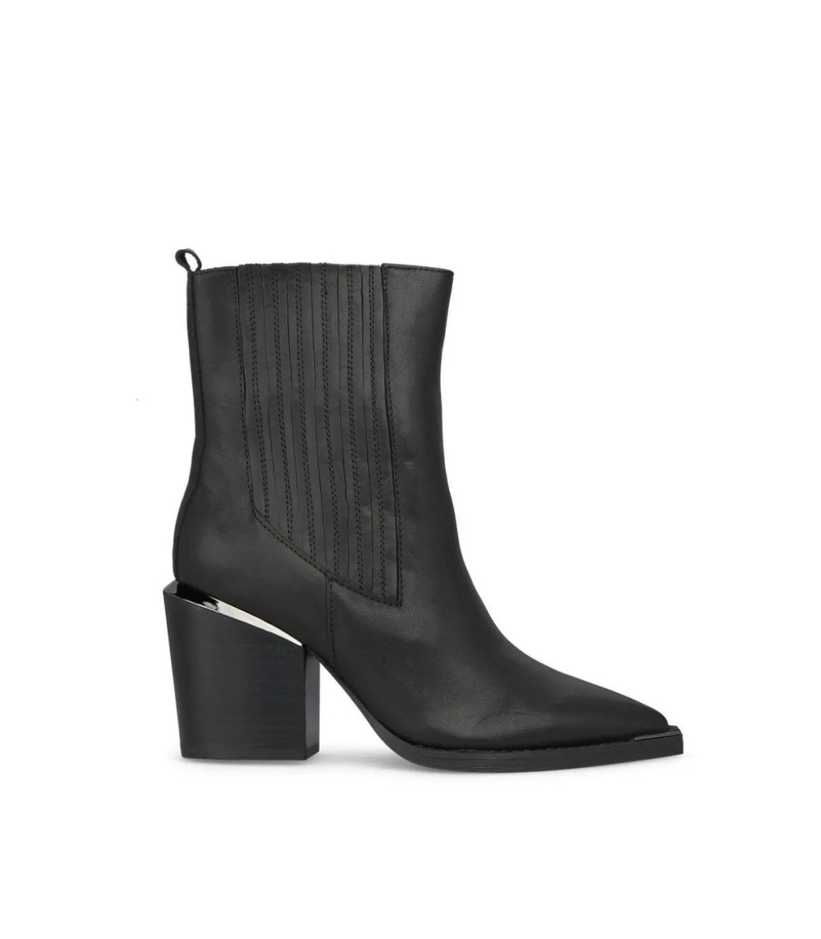Botín de tacón de mujer con la caña recta. Confeccionado en piel con la puntera afilada y sin cierre. La altura del tacón bloque es de 8,5cm y la caña del botín mide 15,5cm.