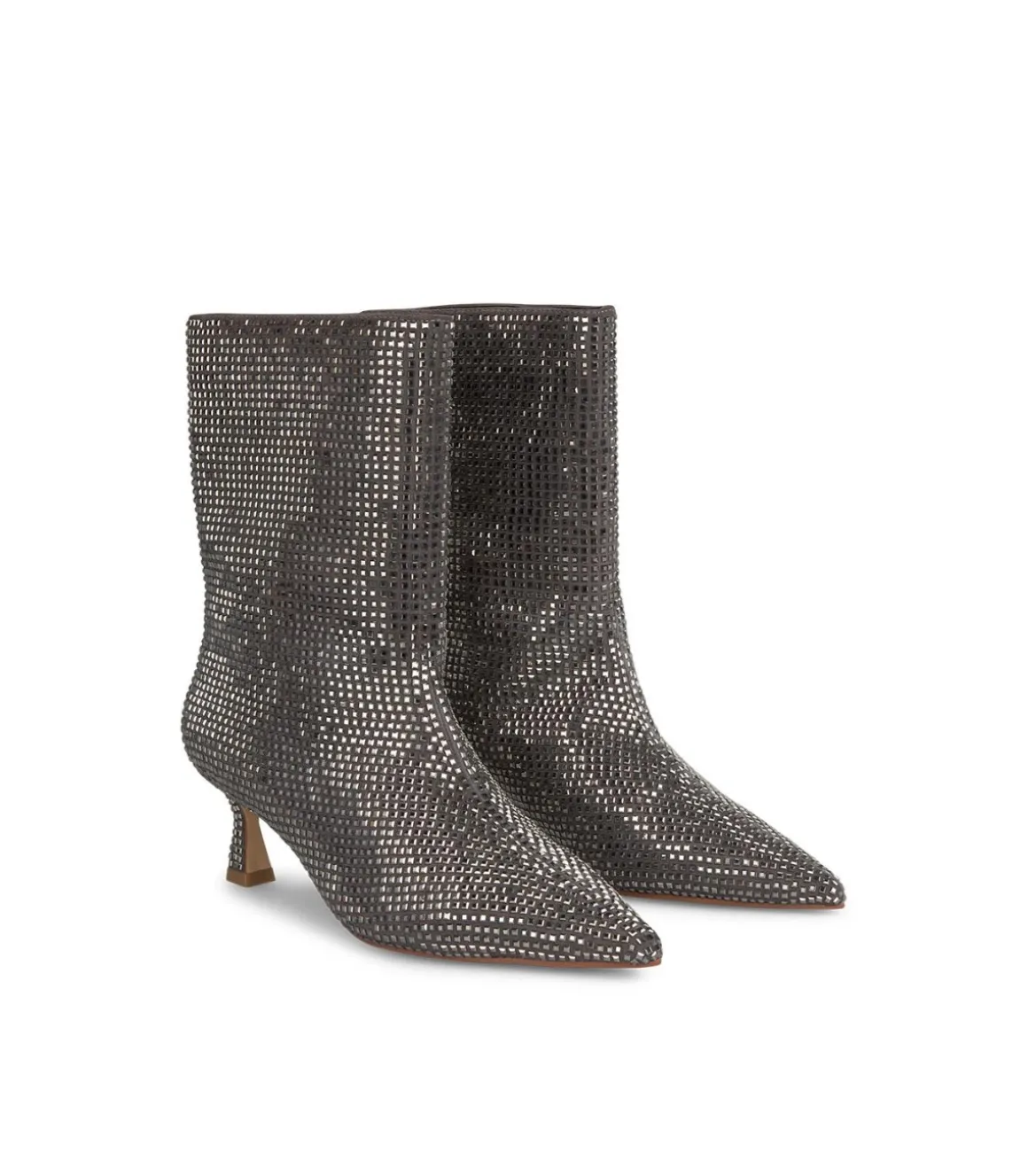 Botín de tacón para mujer con puntera afilada y cubierto de pedrería. La altura del tacón es de 7cm y la caña del b…