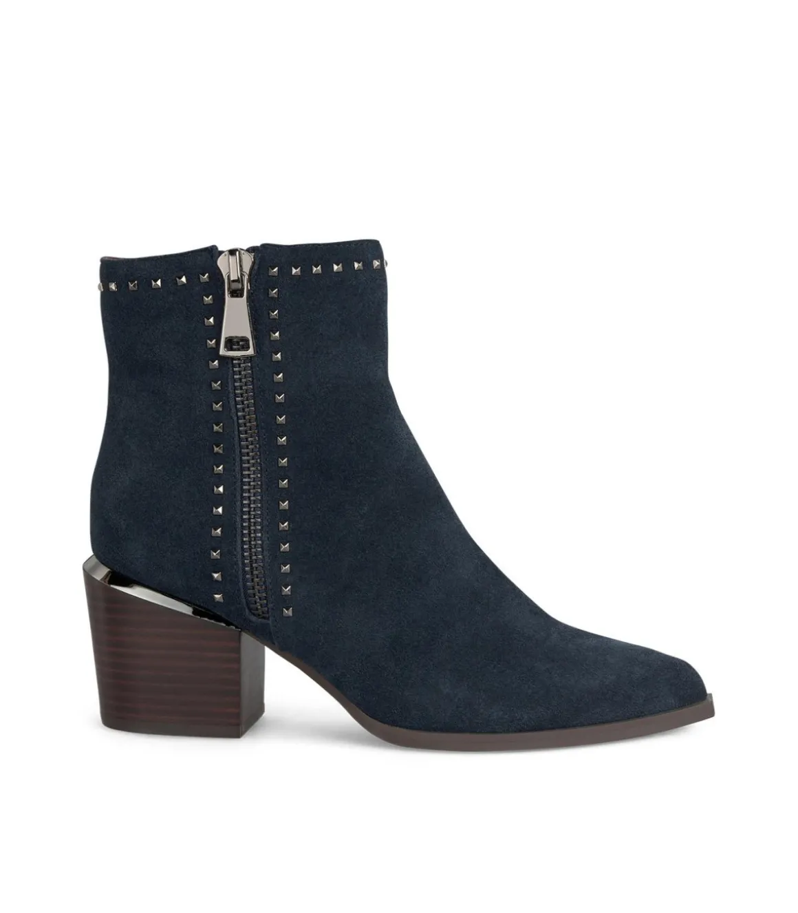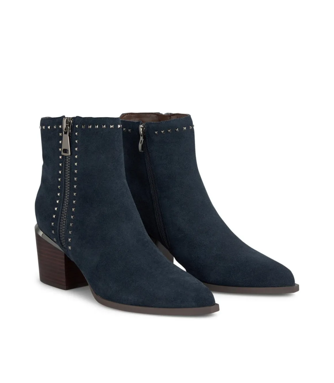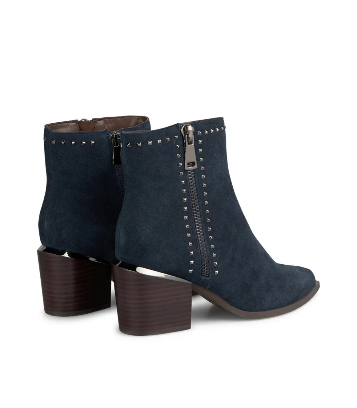Botín de tacón de mujer con tachas y cremallera lateral. Puntera redondeada cierre con cremallera. La altura del tacón de tipo bloque es de 7,3cm y la altura de la caña es de 15cm.
