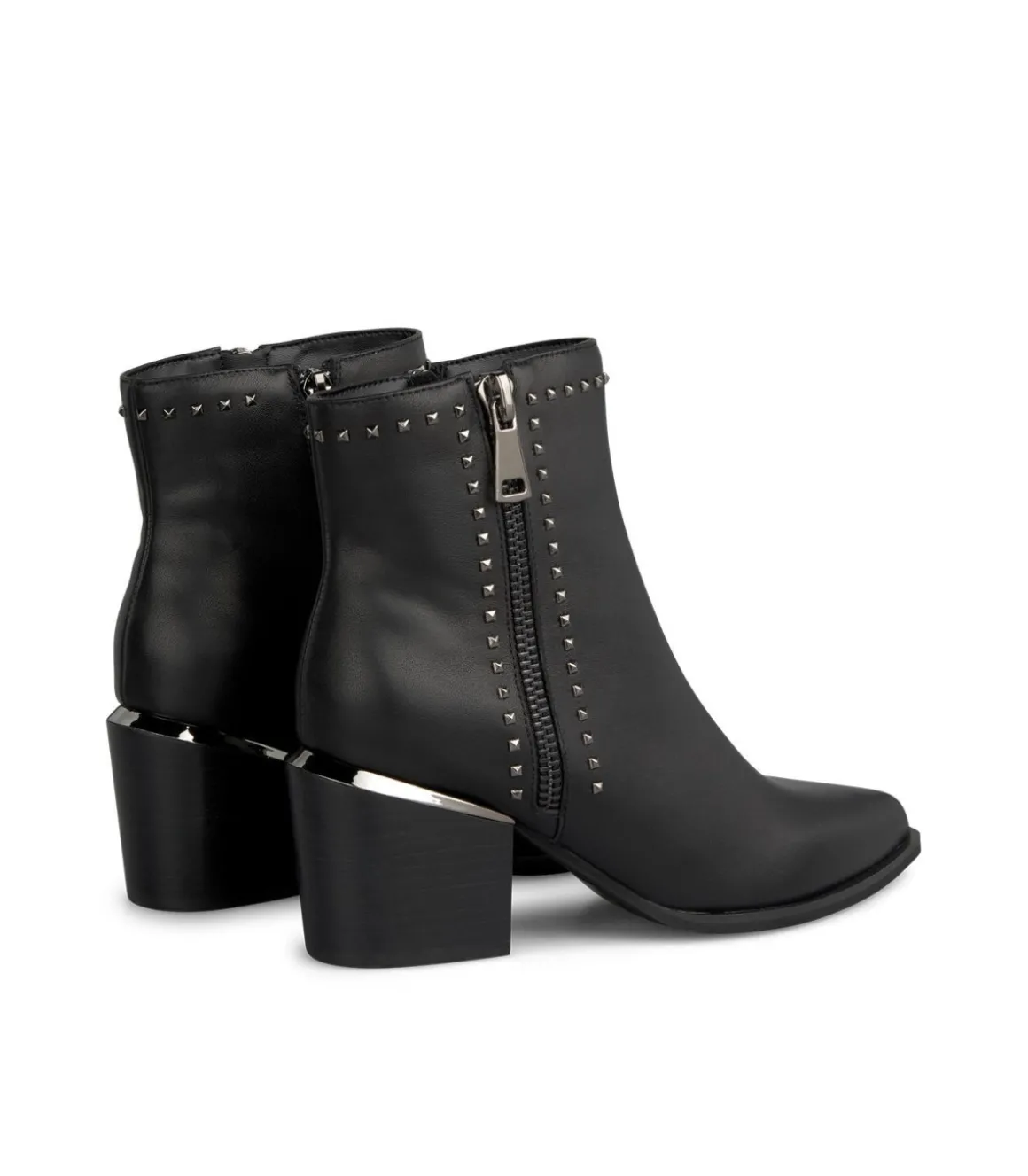 Botín de tacón de mujer con tachas y cremallera lateral. Puntera redondeada cierre con cremallera. La altura del tacón de tipo bloque es de 7,3cm y la altura de la caña es de 15cm.
