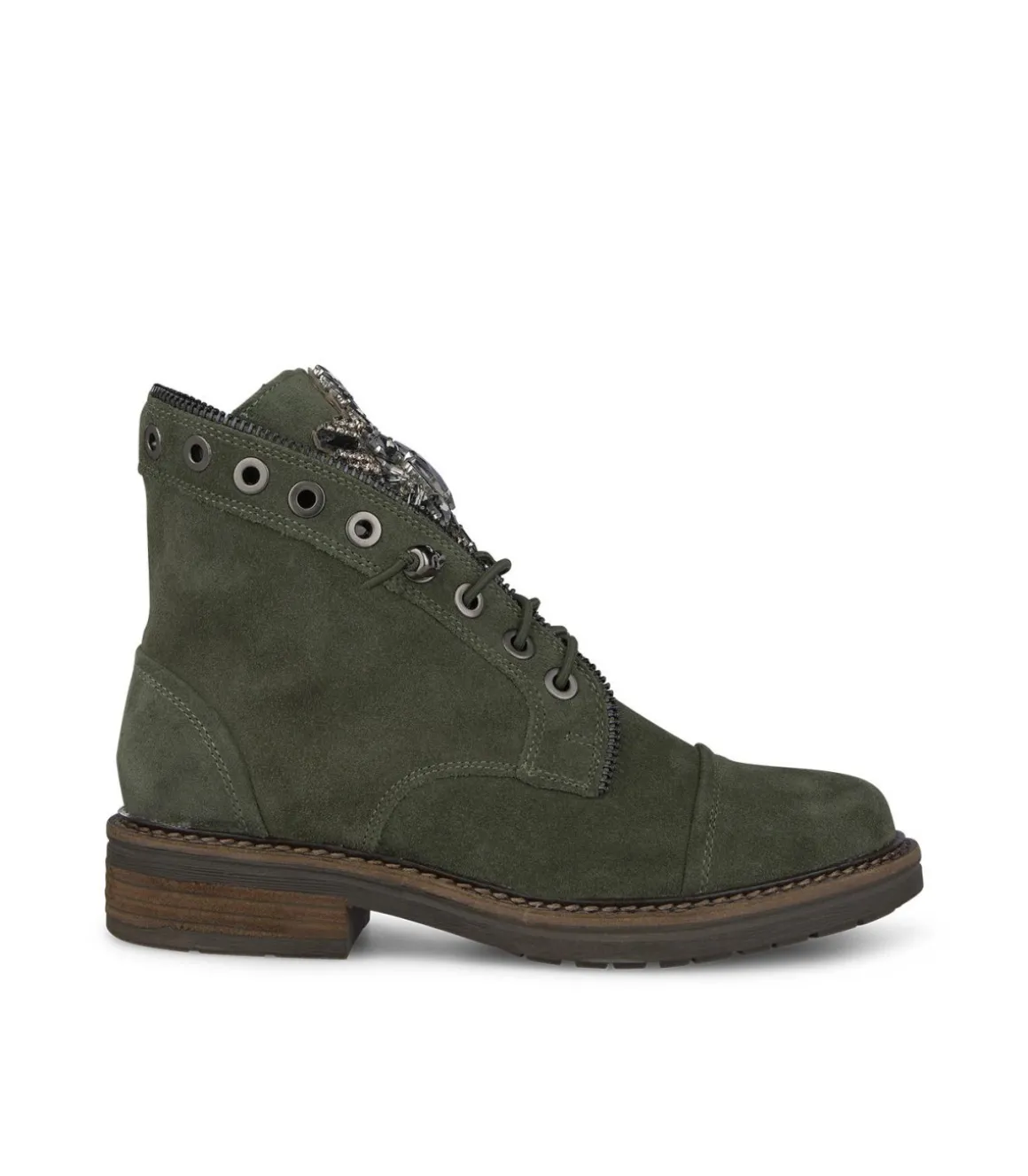 Botín de mujer realizado en piel. Detalles de pedrería en la lengüeta y detalle de cremallera en la parte superior de la caña. Cierre con cordones. La altura del tacón es de 3cm.