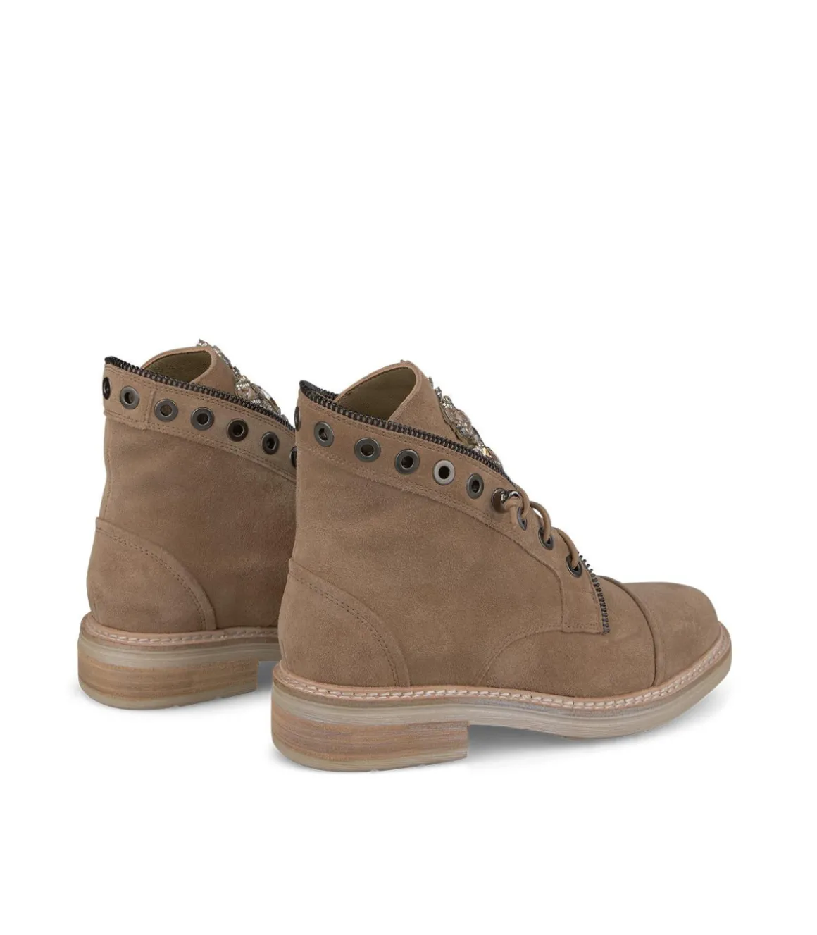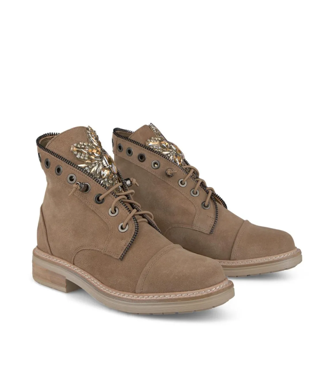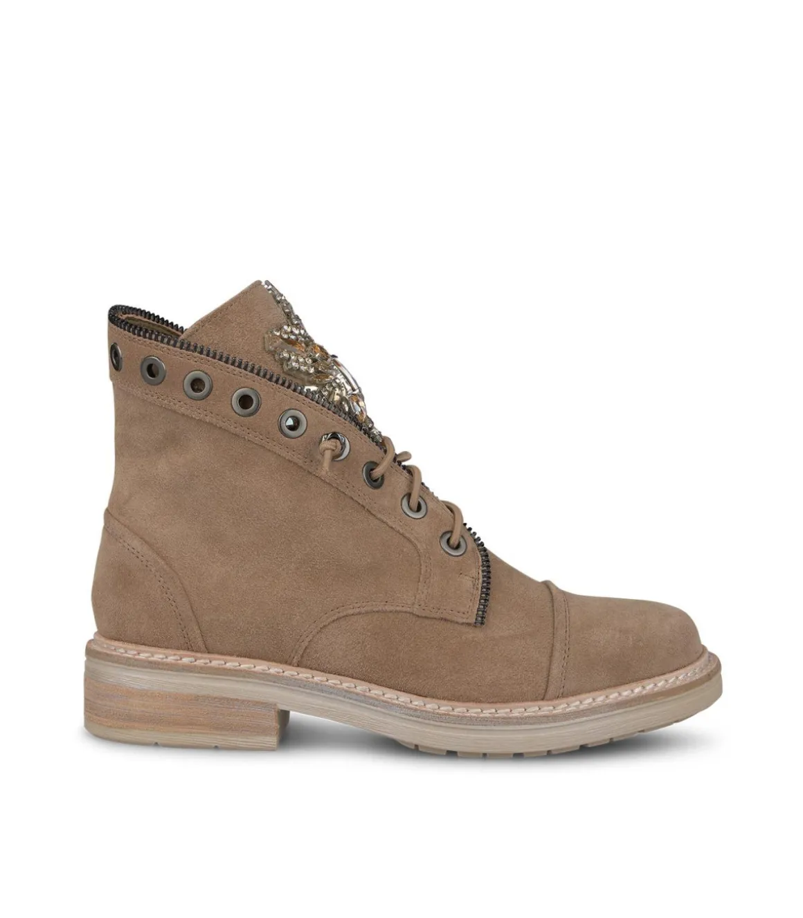 Botín de mujer realizado en piel. Detalles de pedrería en la lengüeta y detalle de cremallera en la parte superior de la caña. Cierre con cordones. La altura del tacón es de 3cm.