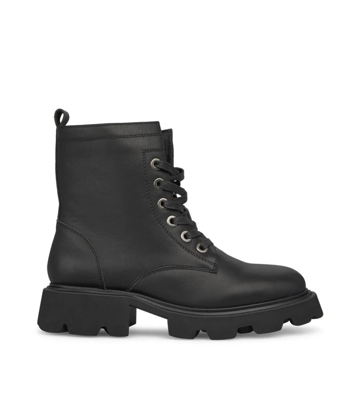 Botín de mujer con suela track. Con puntera redondeada, confeccionado en piel y cierre con cordones. La altura del tacón es de 4,3cm y la caña de la bota mide 15cm.