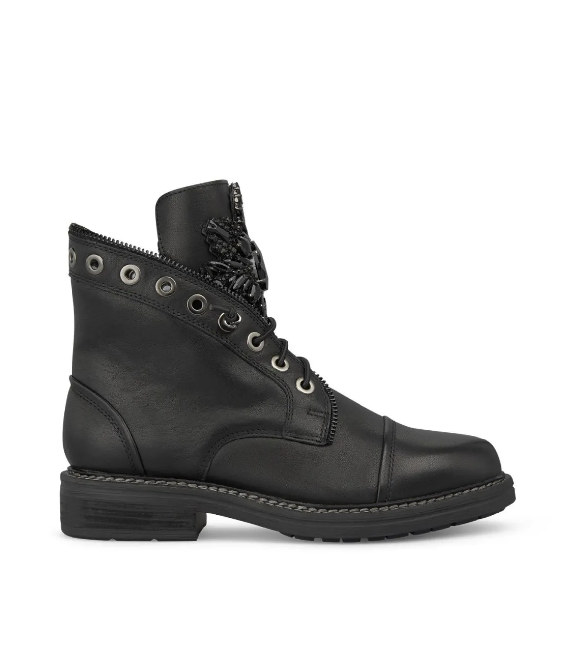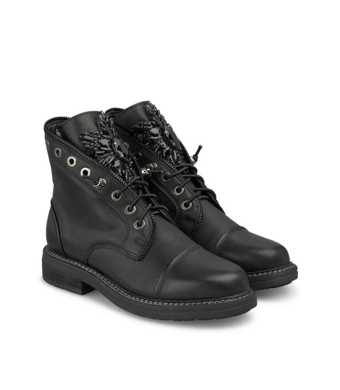 Botín plano de mujer con cordones y detalle de pedrería en la lengüeta. Puntera redondeada y cierre con cordones. La altura del tacón es de 3,5cm y la altura de la caña es de 14,5cm.