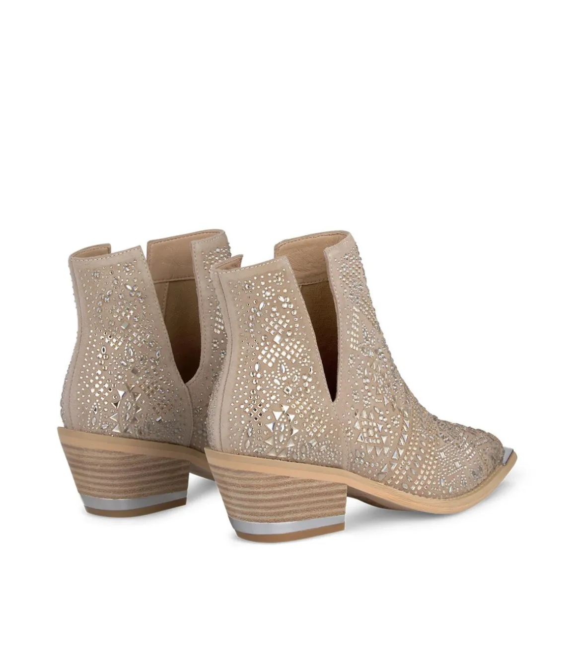 Botín plano de mujer con puntera afilada cubierto con pedrería. Aberturas laterales enla caña. La altura de la caña es de 14,5cm. Y la altura del tacón es de 5,5cm.
