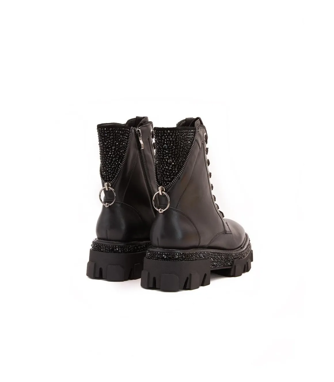 Botín plano realizado en piel. Detalle de pedrería en la suela y cremallera. Cierre con cremallera. Suela tipo track. La altura del tacón es de 5cm.