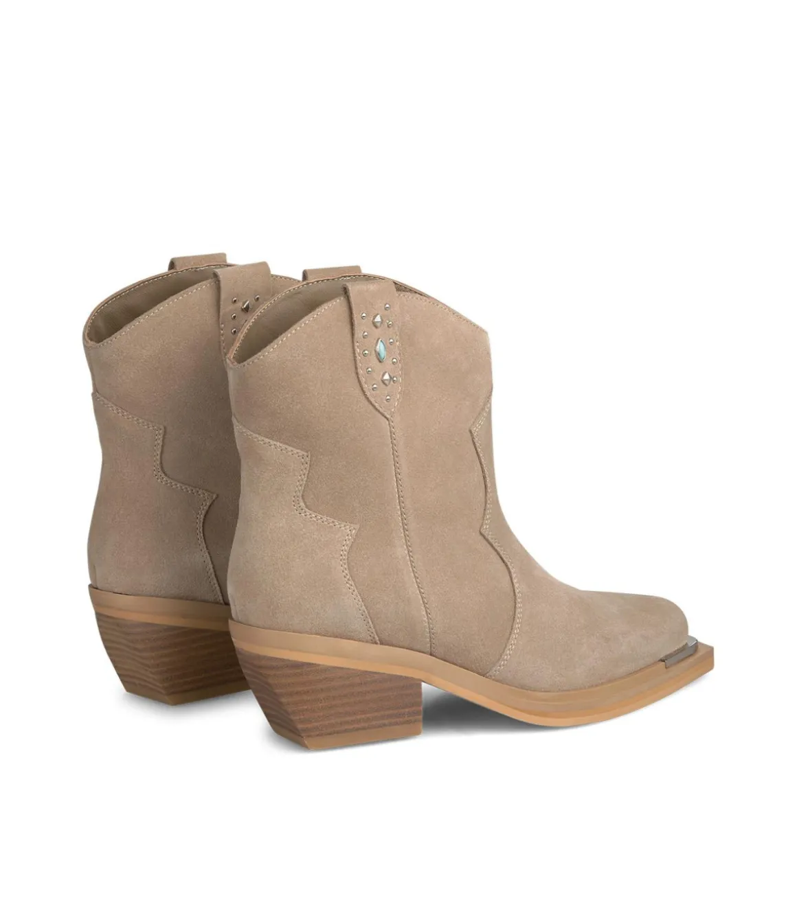 Botín de mujer con detalle de tachas en la caña, realizado en piel. Sin cierre y puntera redondeada. La altura del tacón es de 6 cm y la altura de la caña es de 13 cm.