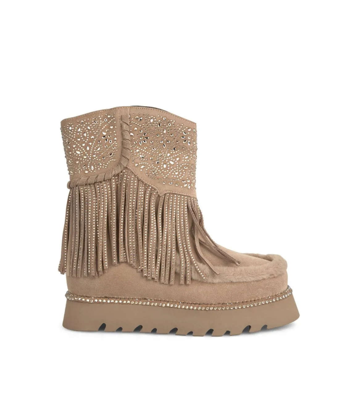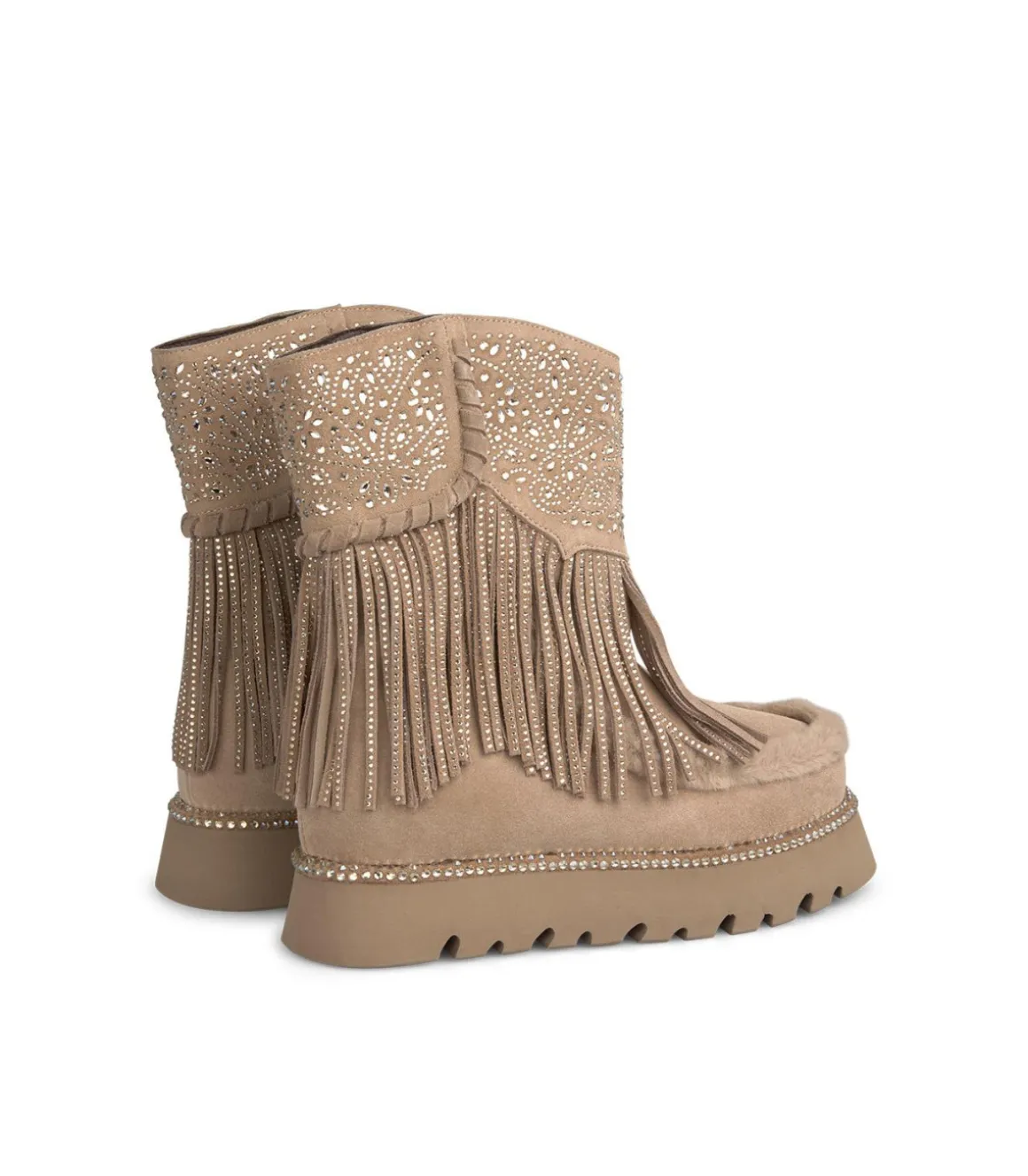 Botín plano de mujer con flecos y detalles. La altura del tacón es de 3,8cm y la altura de la caña es de 20cm.