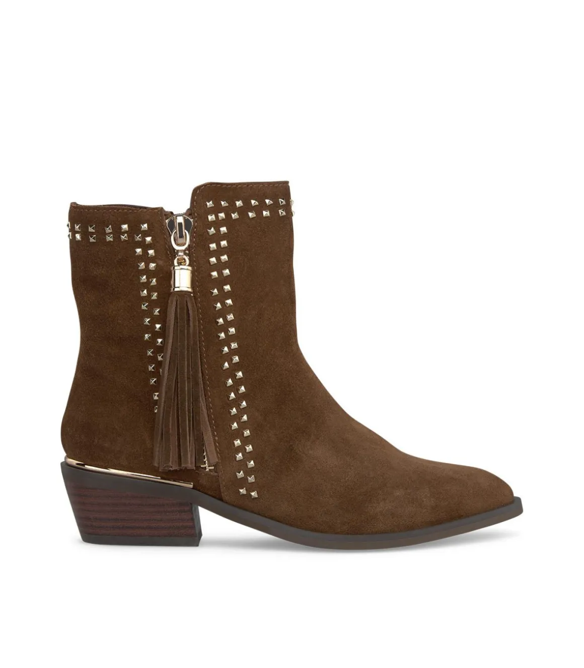 Botín plano de mujer con cremallera lateral y tachas. De la cremallera cuelga una borla. Realizado en piel. La altura d…