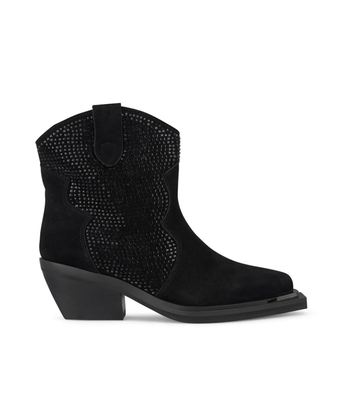 Botín de mujer con detalle de birllos en la caña, realizado en piel. Sin cierre y puntera redondeada. La altura del tacón es de 6cm y la altura de la caña es de 13cm.