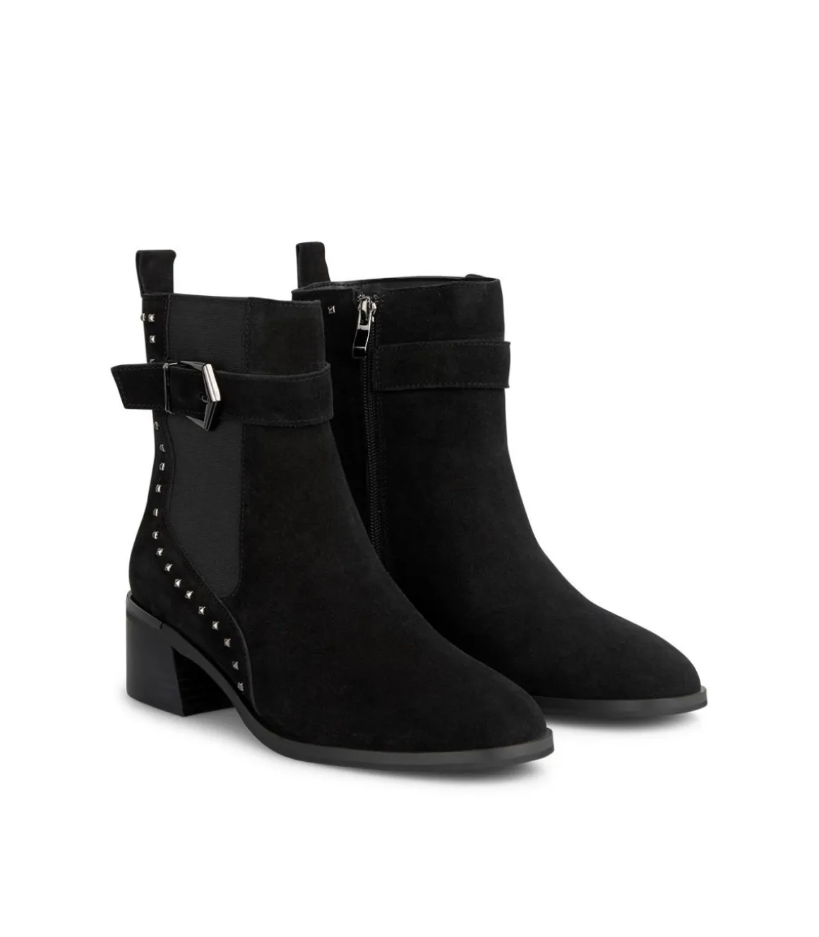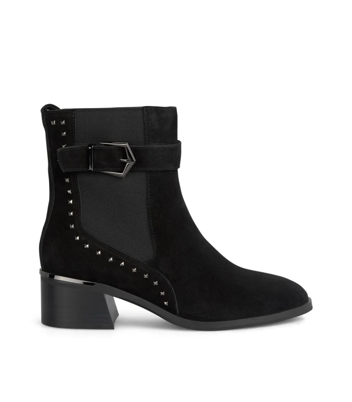 Botín plano de mujer con hebilla lateral y detalle de tachas. La altura del tacón es de 5,5cm y la altura de la caña es de 16,5cm.