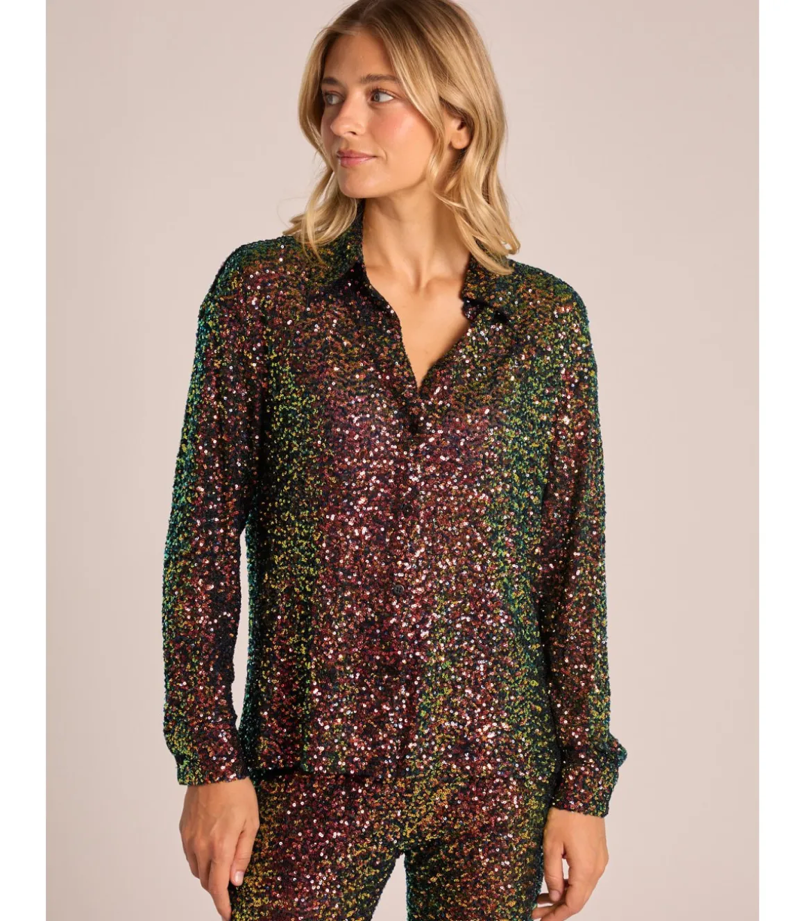 Camisa cubierta de pedrería. Cuello de solapa con escote en pico y manga larga. Cierre frontal con botones. Medidas de la modelo: altura 1,69cm, pecho 82cm, cintura 60cm y cadera 88cm.