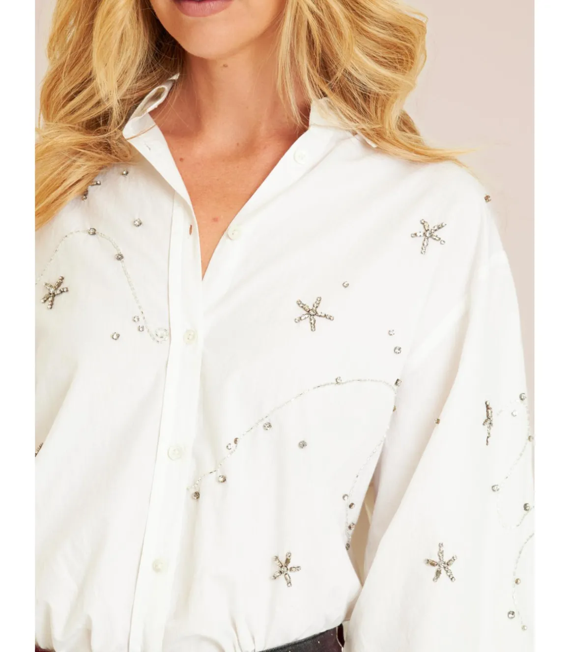 Camisa con detalles de pedrería de mujer. Cuello de solapa con escote en pico y manga larga. Cierre frontal con botones, confeccionada en algodón. Medidas de la modelo: altura 1,69cm, pecho 82cm, cintura 60cm y cadera 88cm.