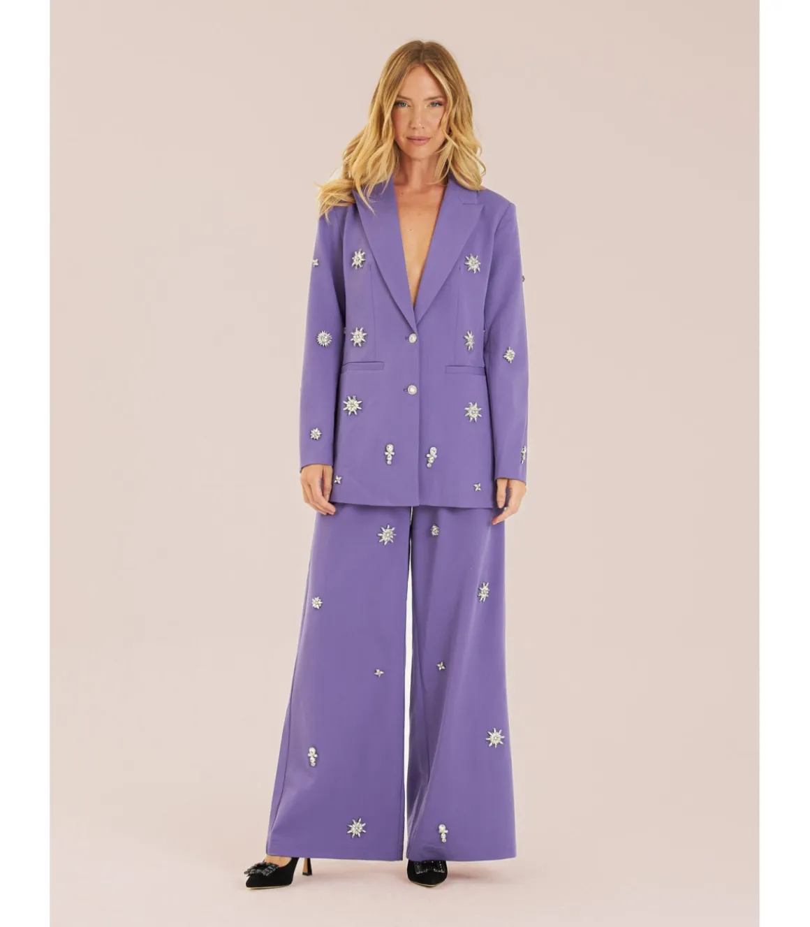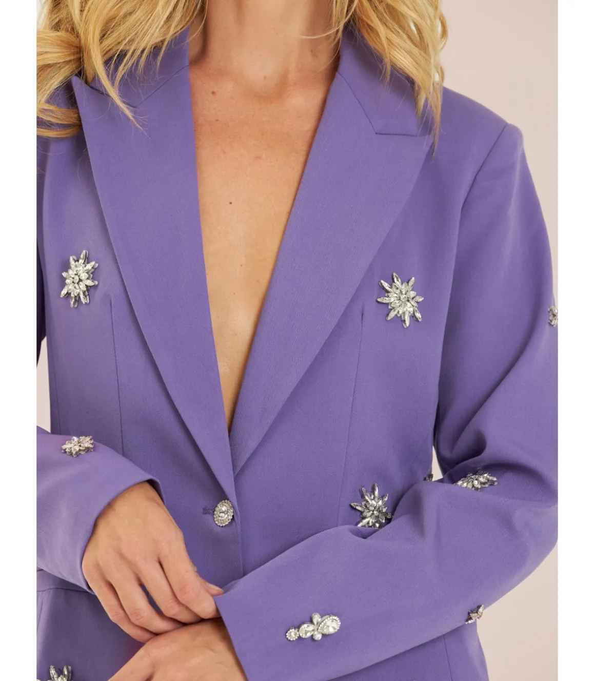 Blazer de mujer con cuello solapa y manga larga cubierta con abalorios de pedrería. Bolsillos delanteros y cierre front…
