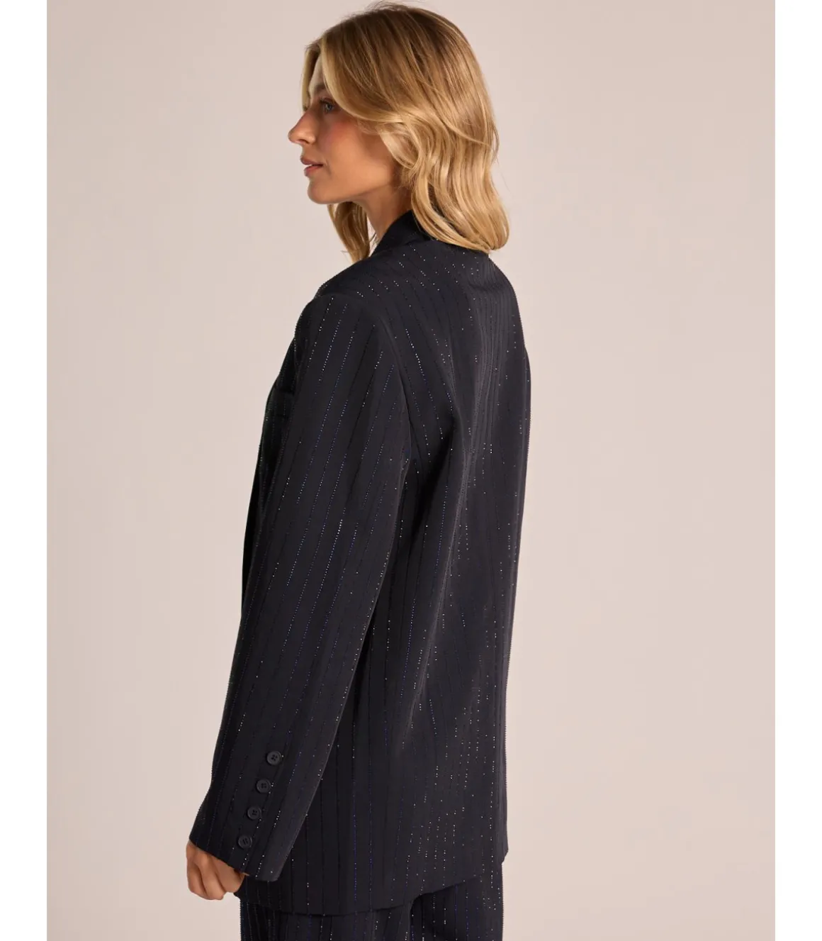 Blazer de mujer con cuello solapa y manga larga tipo raya diplomática con pedrería. Bolsillos delanteros y cierre frontal con botón. Medidas de la modelo: altura 1,69cm, pecho 82cm, cintura 60cm y cadera 88cm.