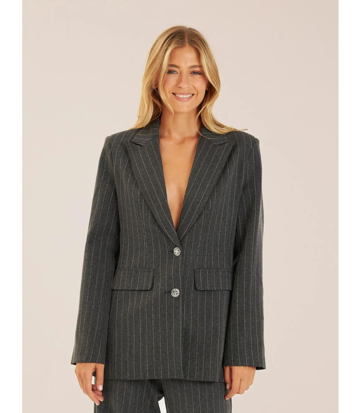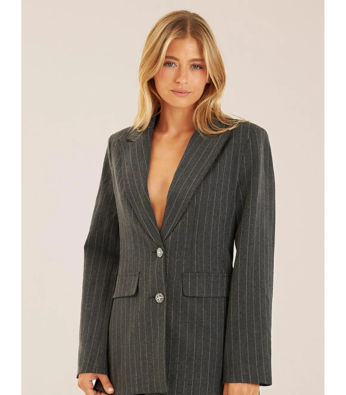 Blazer de mujer con cuello solapa y manga larga con raya diplomática. Con detalles. Bolsillos delanteros y cierre frontal con botón joya. Medidas de la modelo: altura 1,69cm, pecho 82cm, cintura 60cm y cadera 88cm.