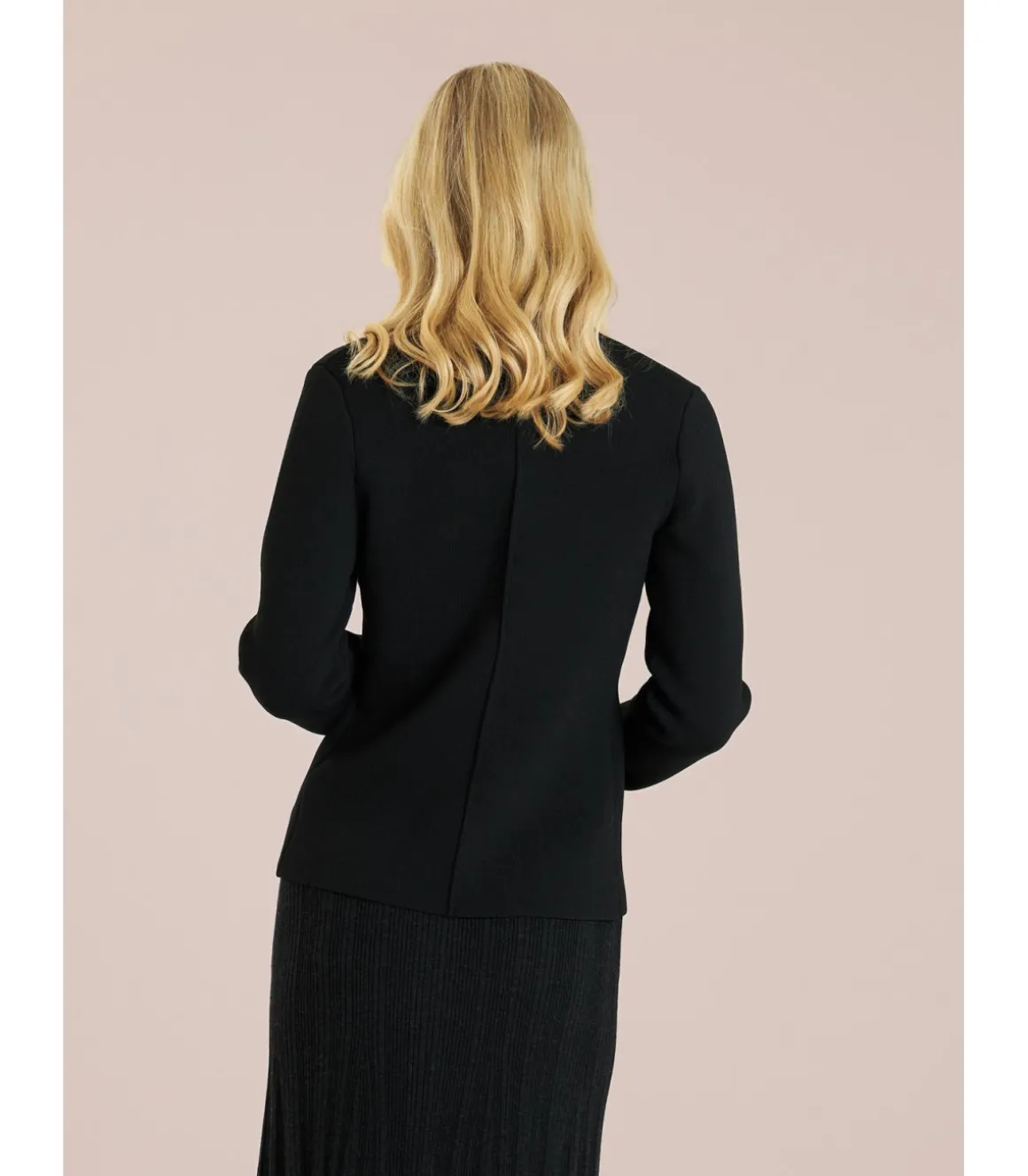 Chaqueta de punto de mujer. Confeccionada en viscosa con botón de joya y cuello de solapa. Las medidas de la modelo vistiendo la talla S son: altura 1,68cm, pecho 87cm, cintura 63cm y cadera 88cm.