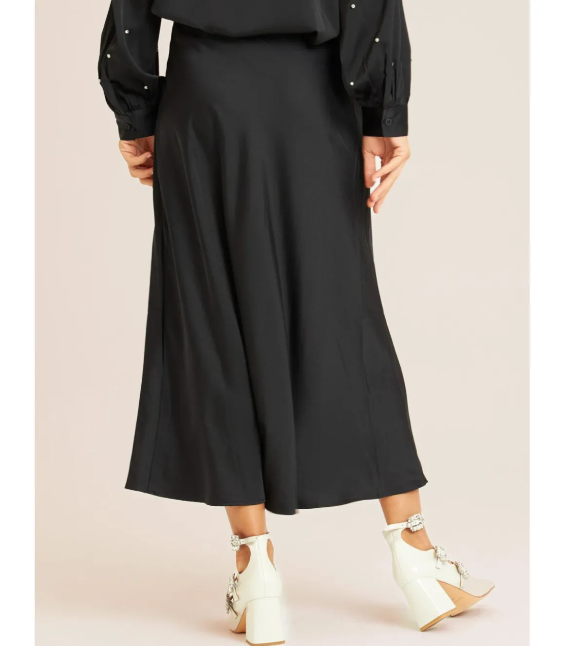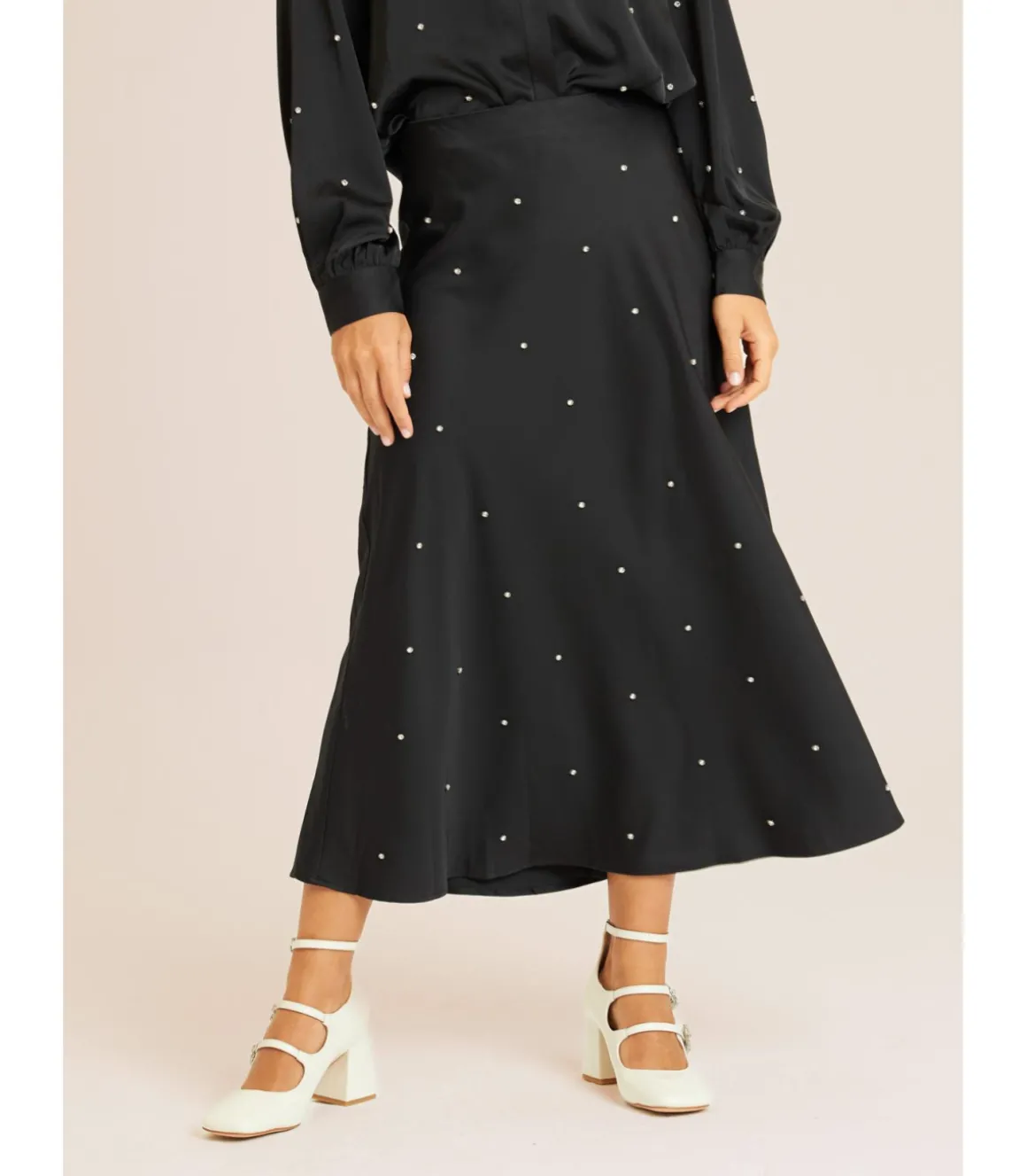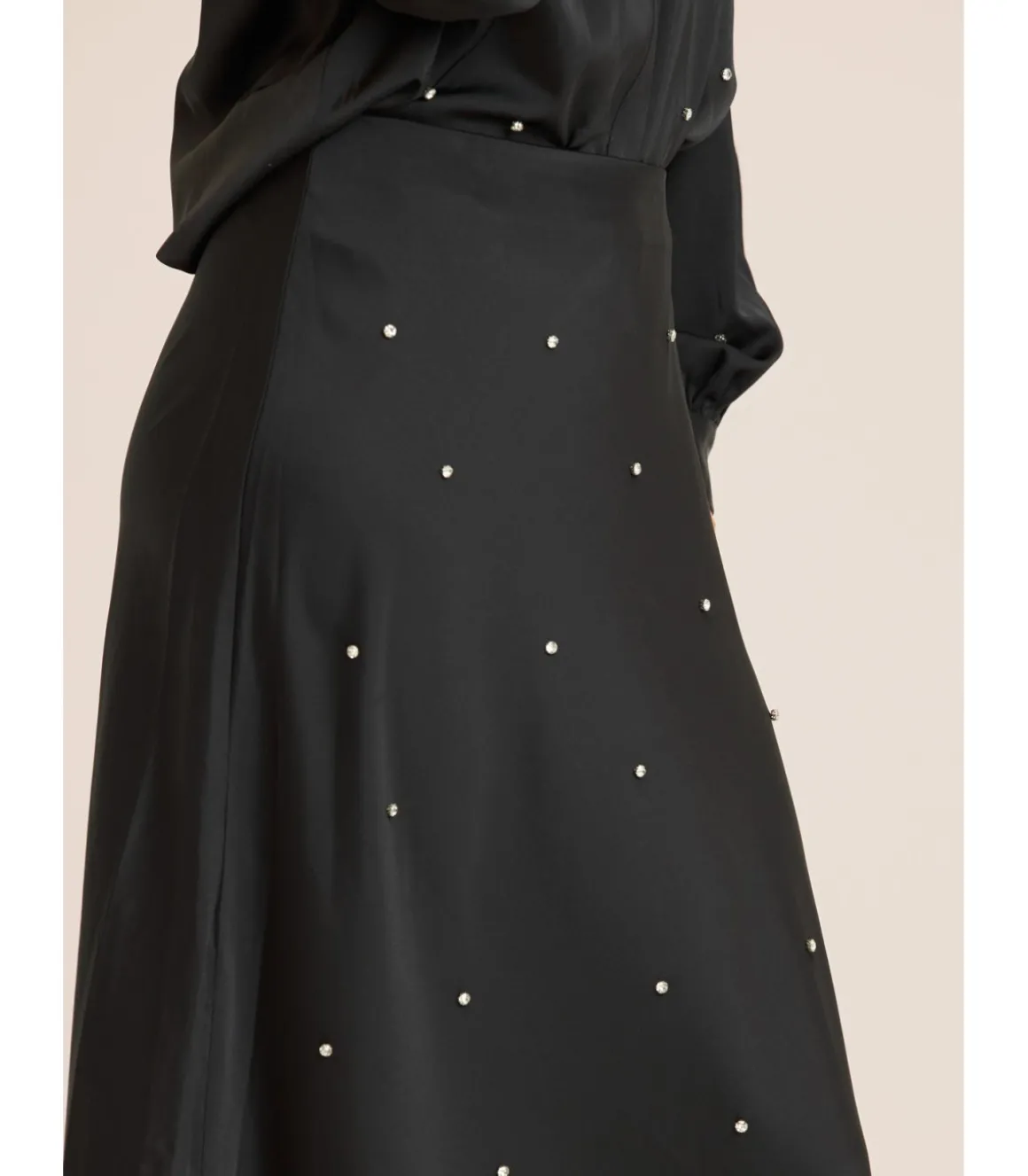Falda larga satinada de mujer con detalles de pedrería por la parte delantera. Confeccionada en poliéster y cierre con cremallera lateral. as medidas de la modelo vistiendo la talla S son: altura 1,68cm, pecho 87cm, cintura 63cm y cadera 88cm.