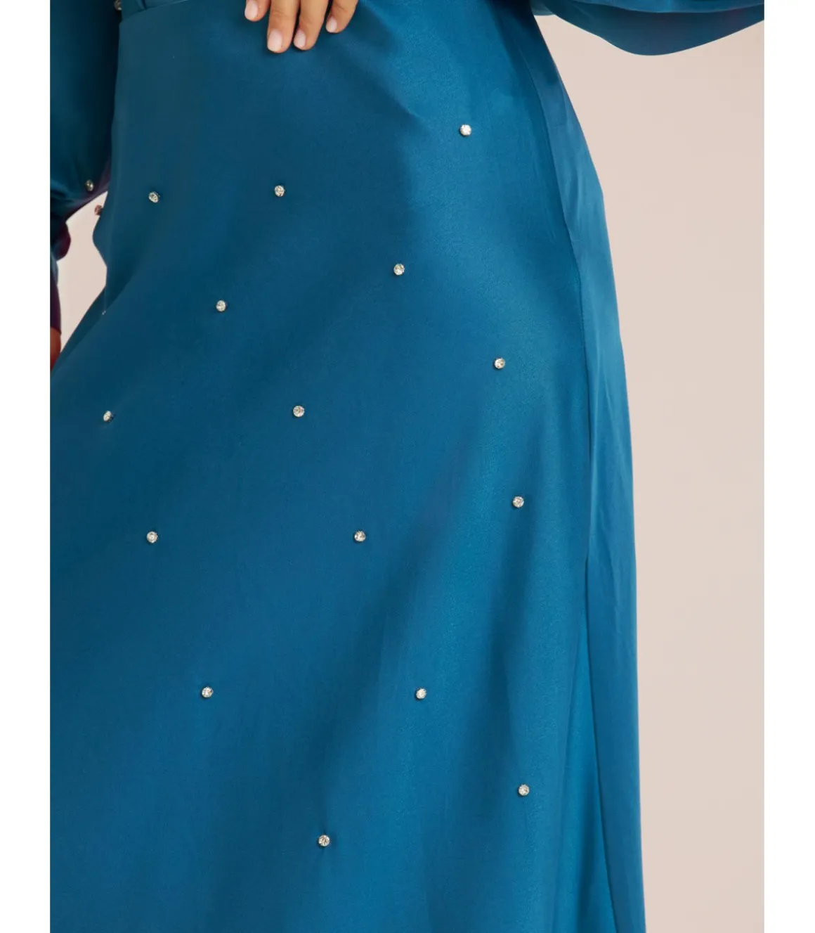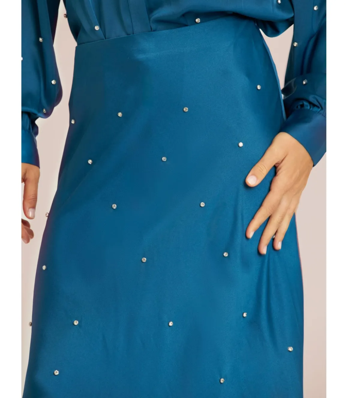 Falda larga satinada de mujer con detalles de pedrería por la parte delantera. Confeccionada en poliéster y cierre con…