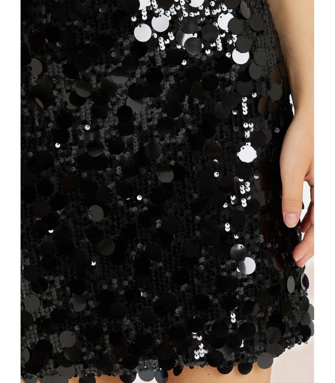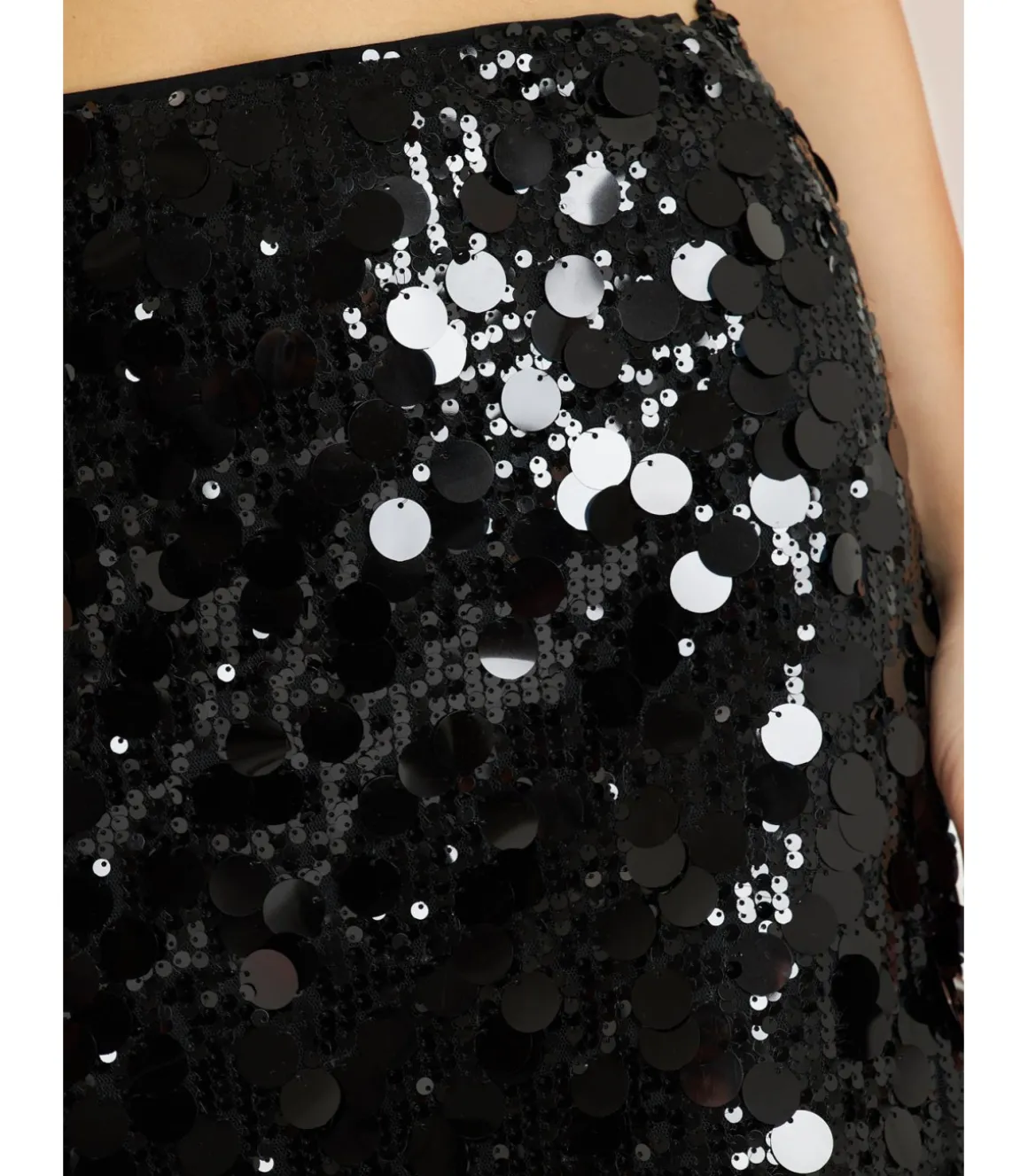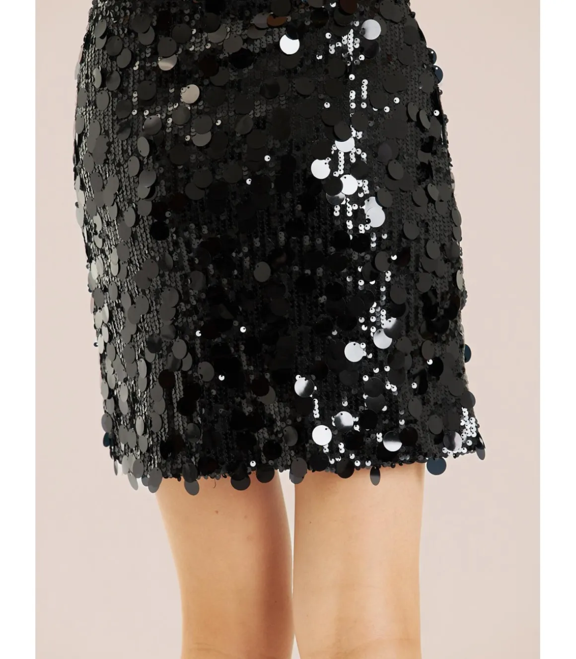 Falda mini cubierta con lentejuelas de mujer. Cierre con cremallera. Medidas de la modelo: altura 1,69cm, pecho 82cm, cintura 60cm y cadera 88cm.