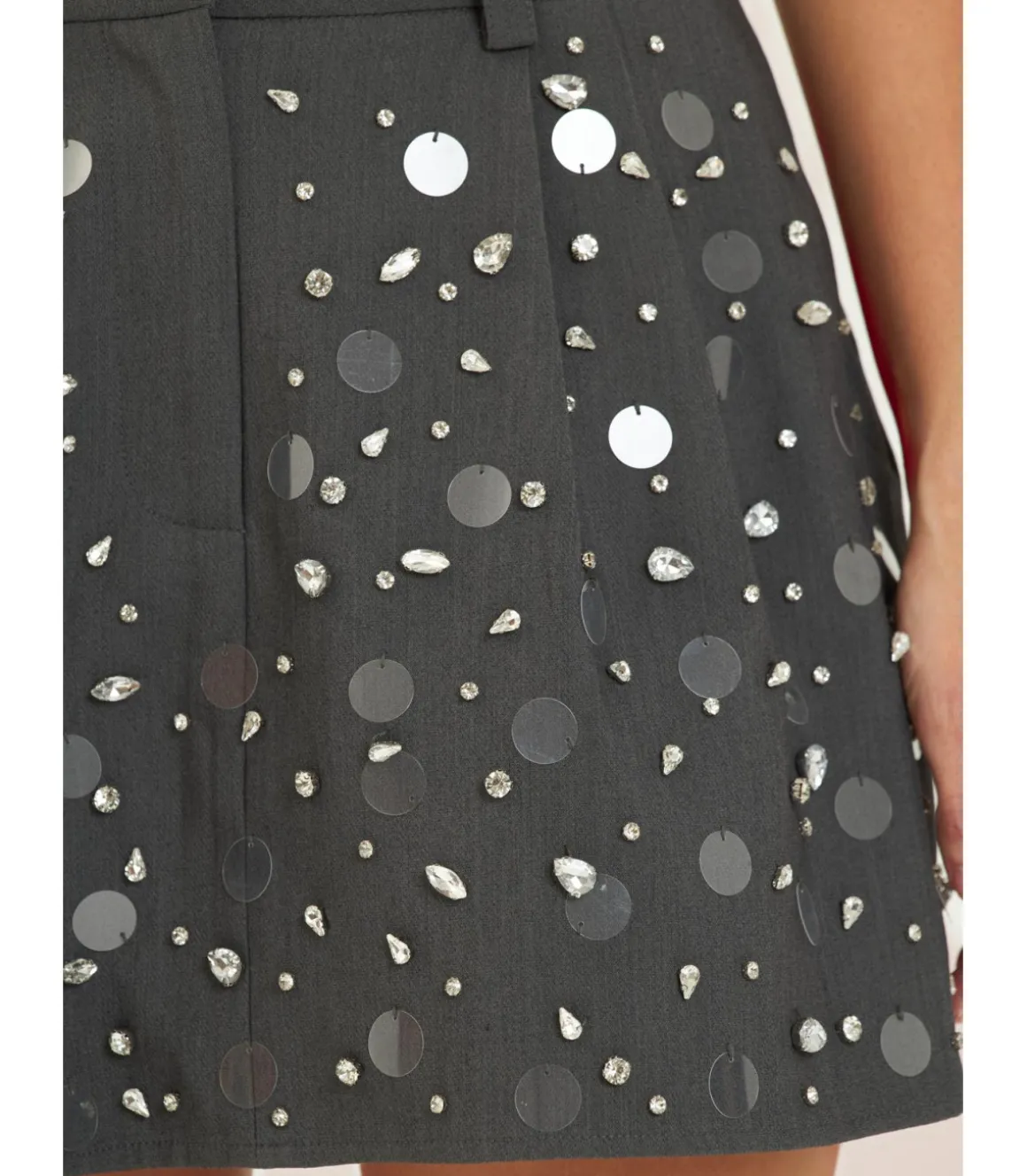 Falda fantalón de mujer confeccionada el poliéster un 74%. Con detalles de abalorios en la parte delantera y cierre con cremallera. Las medidas de la modelo vistiendo la talla S son: altura 1,68cm, pecho 87cm, cintura 63cm y cadera 88cm.
