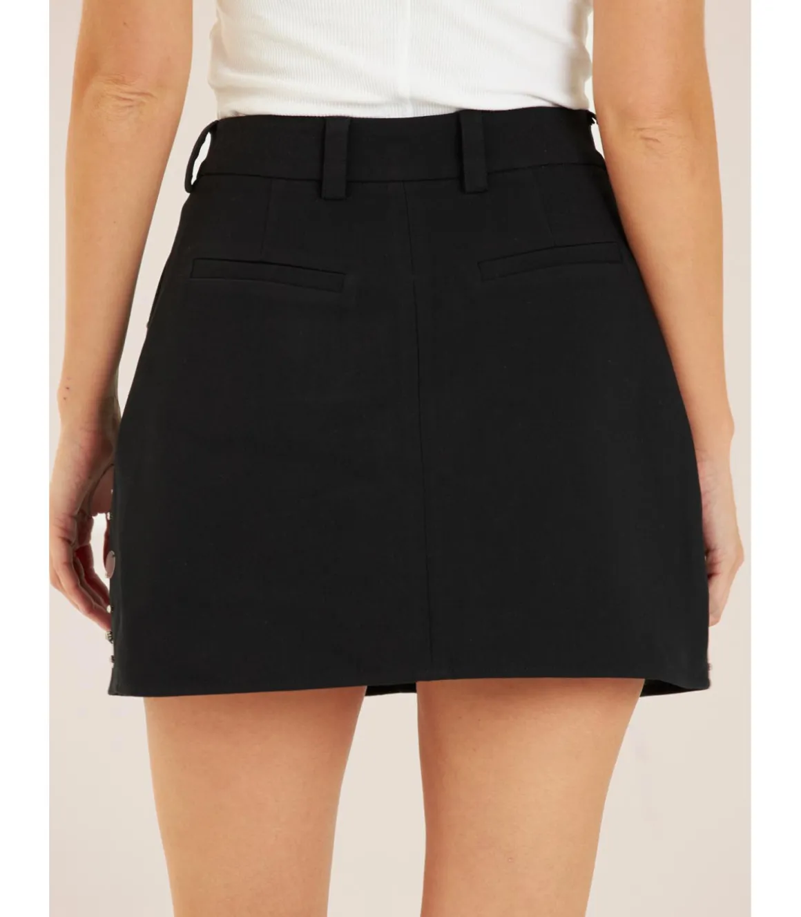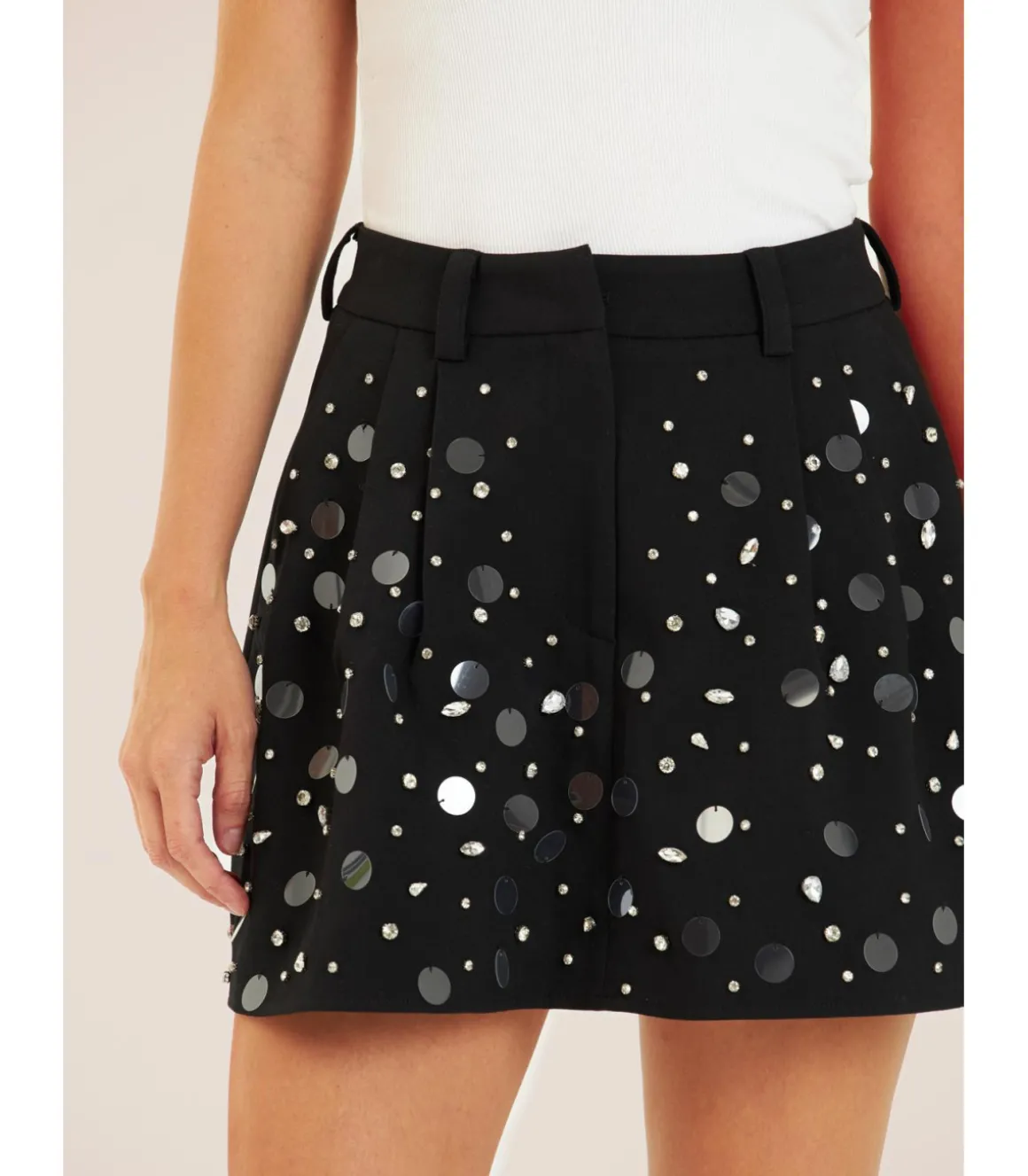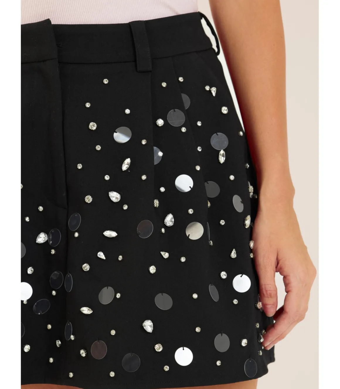 Falda fantalón de mujer confeccionada el poliéster un 74%. Con detalles de abalorios en la parte delantera y cierre con cremallera. Las medidas de la modelo vistiendo la talla S son: altura 1,68cm, pecho 87cm, cintura 63cm y cadera 88cm.