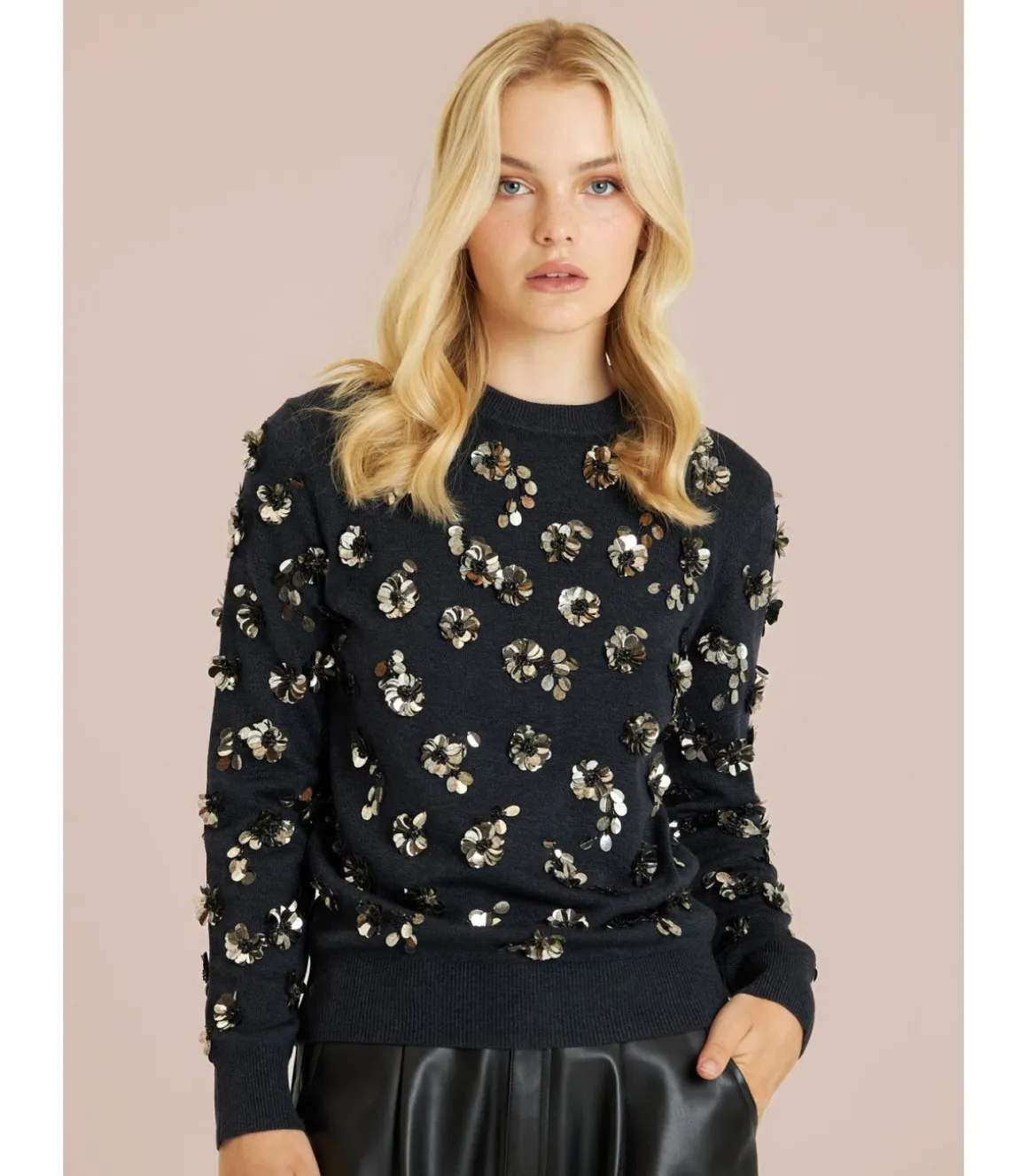 Jersey de punto de mujer con abalorios en forma de flor y manga larga. Medidas de la modelo: altura 1,69cm, pecho 82cm, cintura 60cm y cadera 88cm.